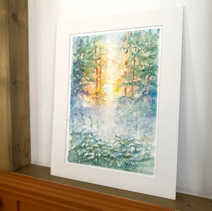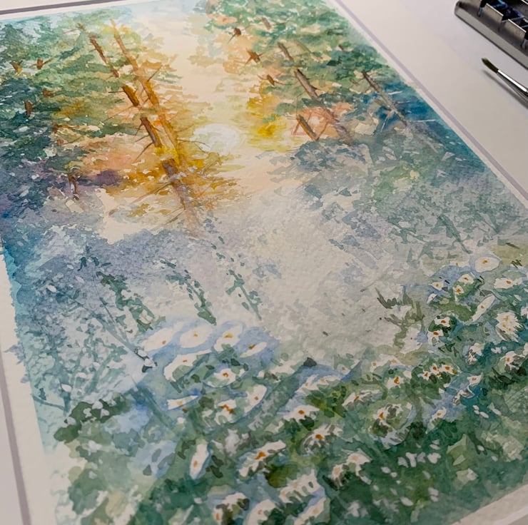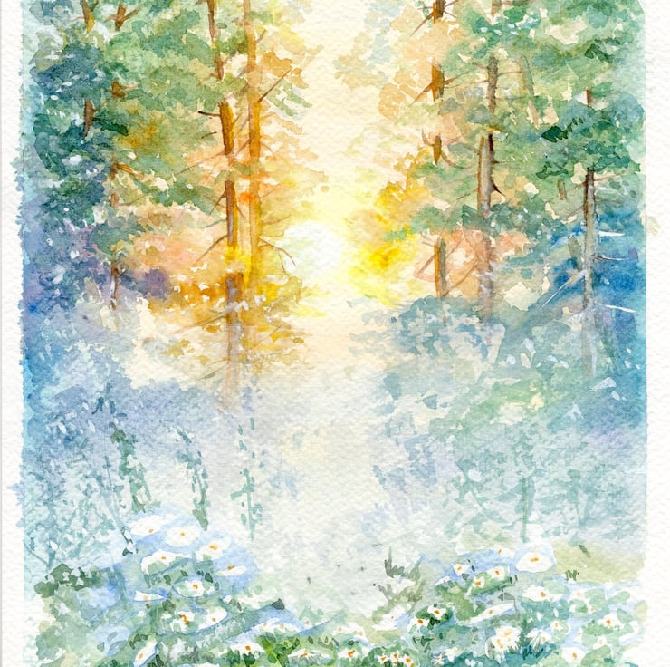 The sun shines through and the fog lifts; it's a beautiful moment captured in watercolour.
