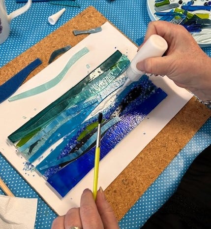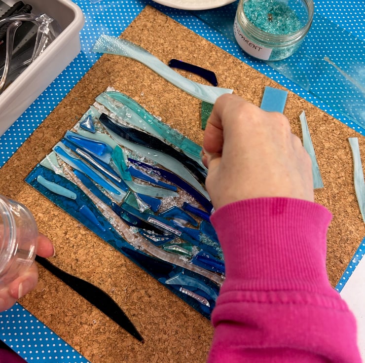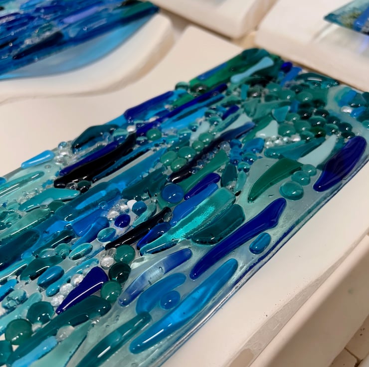 In this workshop you will create a stunning fused glass wave using lots of different colours and shades of blue glass to create a water effect. You will learn how to build up your artwork by using small pieces, glass paint and frits (crushed glass). This workshop will require you to cut glass, but please don't let this put you off, I will teach you how to do that and it's super fun!