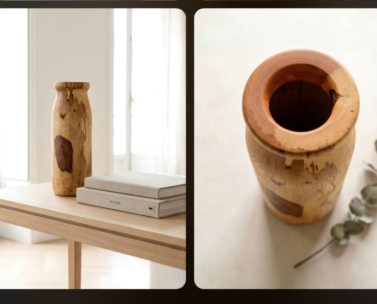 The inspiration for this vase came from the natural movement within ash wood. The interplay between lighter and darker grain creates patterns that feel almost painted, yet are entirely formed by nature. I wanted to emphasise that character in a tall, elegant shape—allowing the eye to travel up the grain and fully appreciate the story held within the wood.