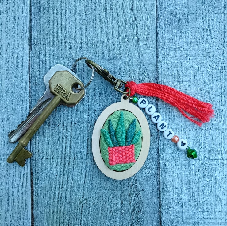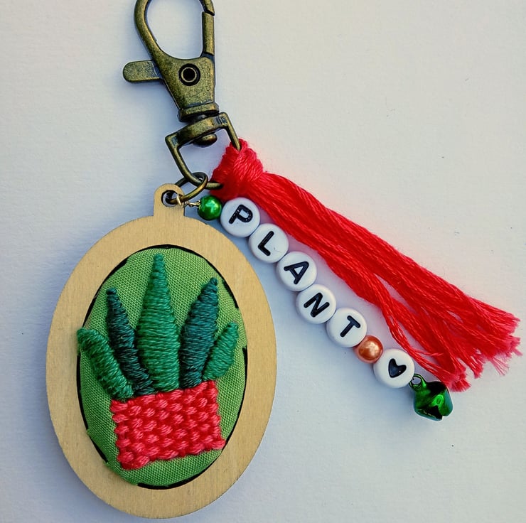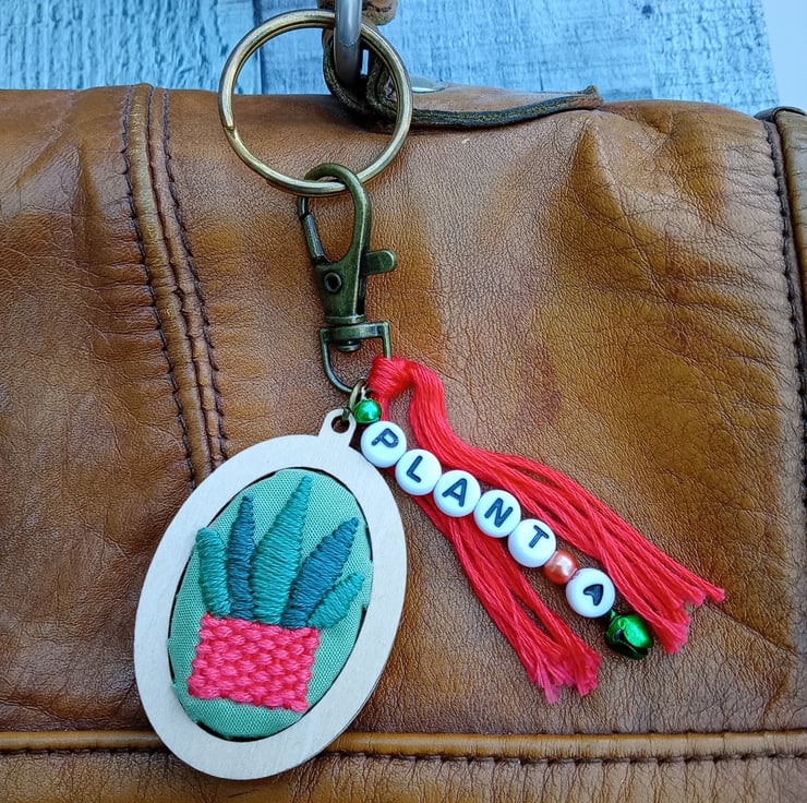 A hand embroidered house plant keyring/bag charm with the word ‘plant’ in letter beads, adorned with coloured beads and a bell, finished with a coral tassel.