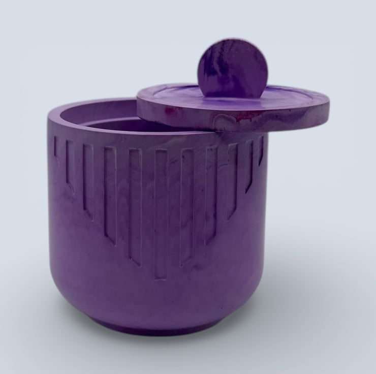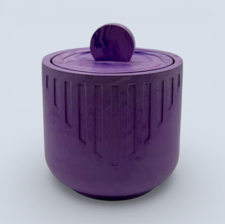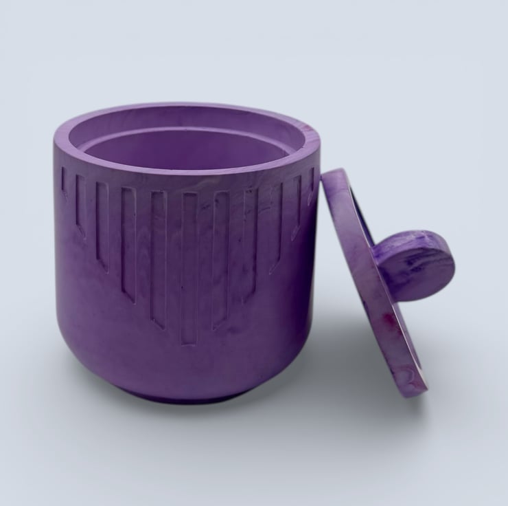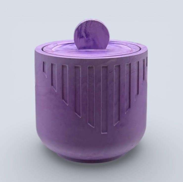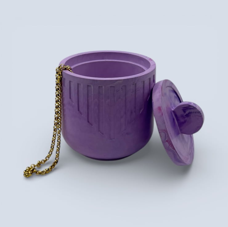 The jewellery box is handmade from a natural water based mineral material with a hard stone like finish. The exterior shows gentle lilac and white marbling with carved vertical detailing, and the rounded shape gives it a smooth contemporary look. The matching lid has a domed circular handle and sits neatly on top. Natural variations such as small air bubbles or slight colour differences may appear, making each piece unique.