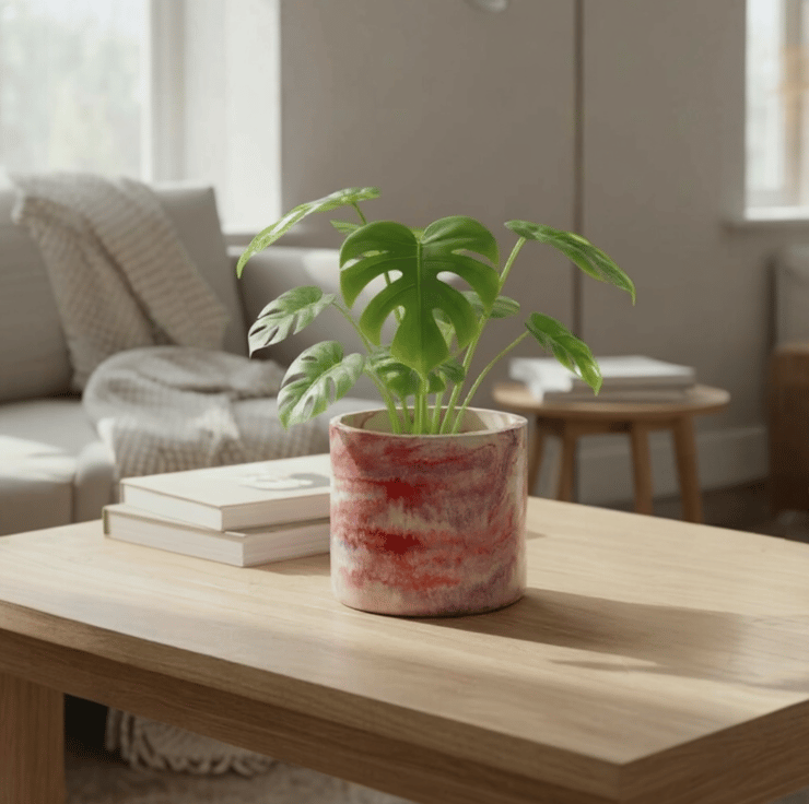 Soft morning light, a quiet room, and a moment to breathe. This marbled plant pot brings together gentle swirls of lilac, raspberry and pink, echoing the subtle colours you might notice in a sky just before sunset. Paired with fresh green leaves, it becomes a small but grounding presence, adding warmth and colour without shouting for attention.