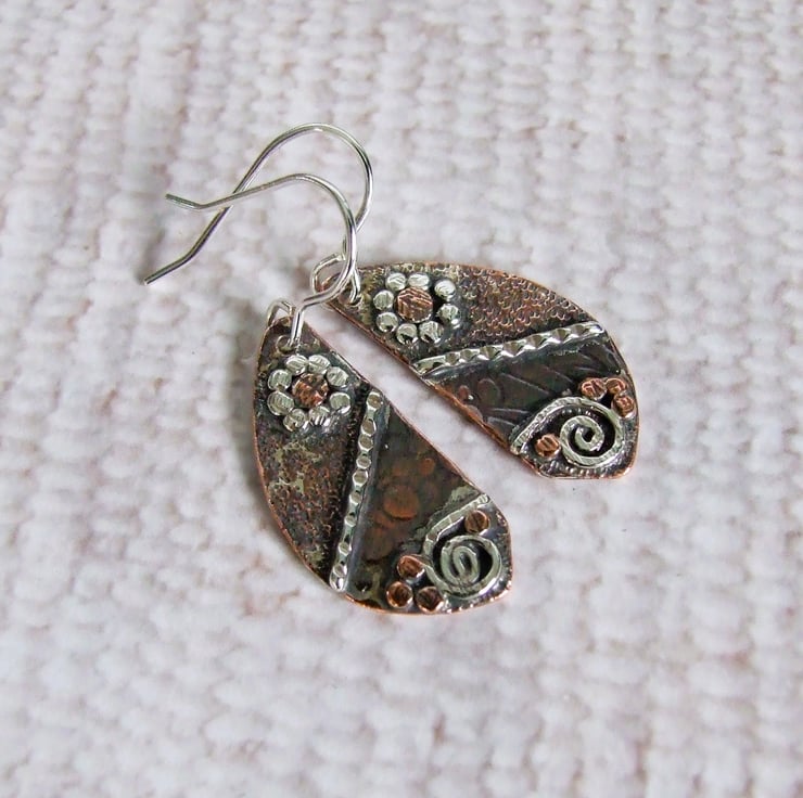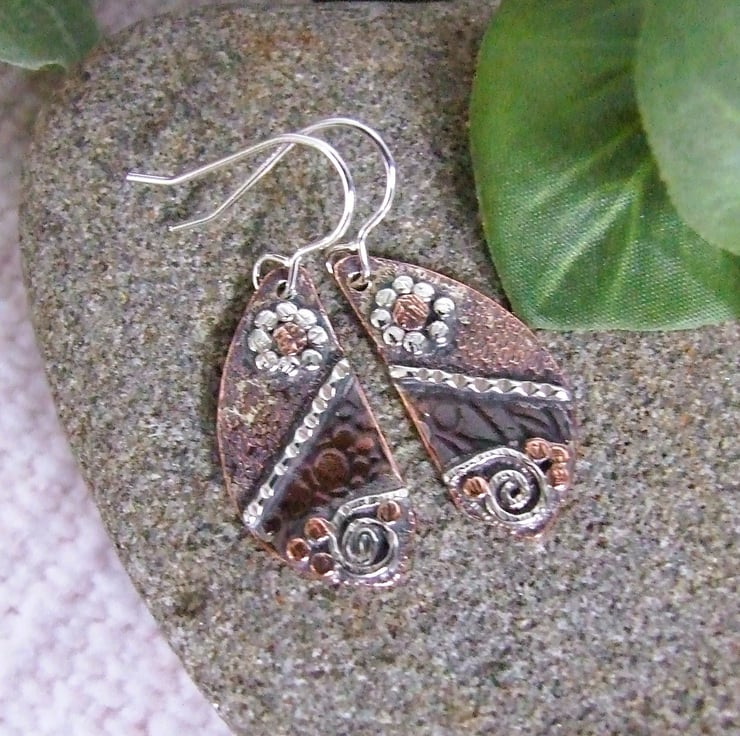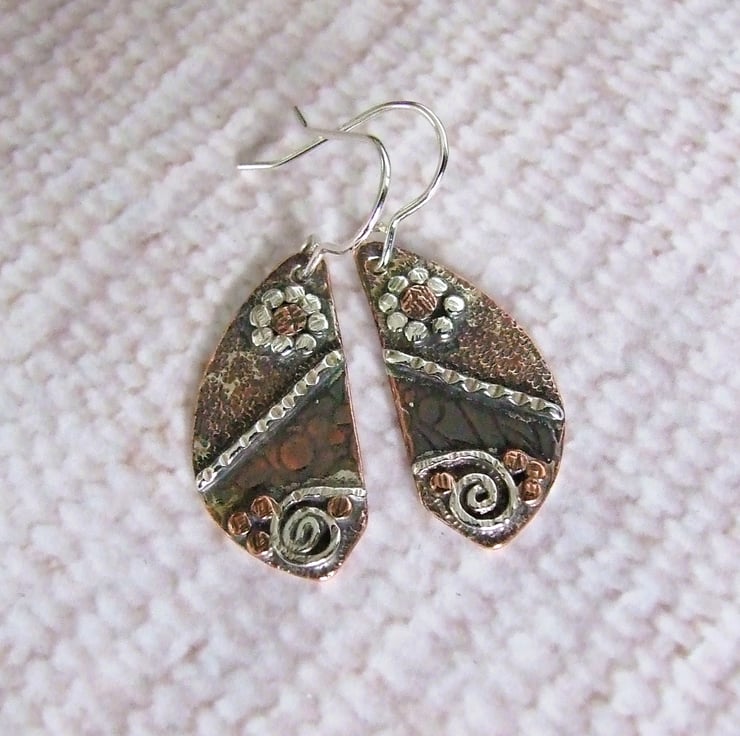 Copper leaf dropper earrings with silver and copper flowers and scrolls decoration. Sterling silver ear wires.