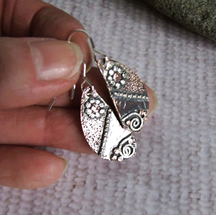 I have created the leaf dropper shapes from copper sheet, hand cut and textured with steel plate. I then soldered individual silver and copper beads to create a flower along with hand rolled scrolls and wire in silver and some copper beads for decoration. Fitted to sterling silver ear hooks
