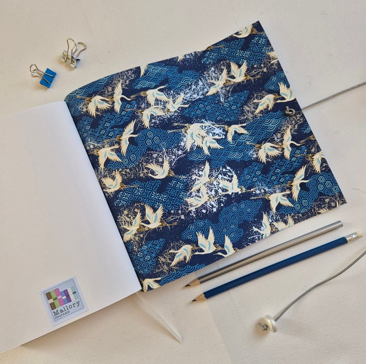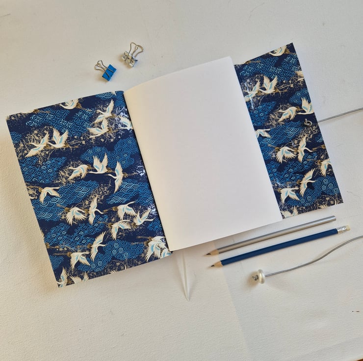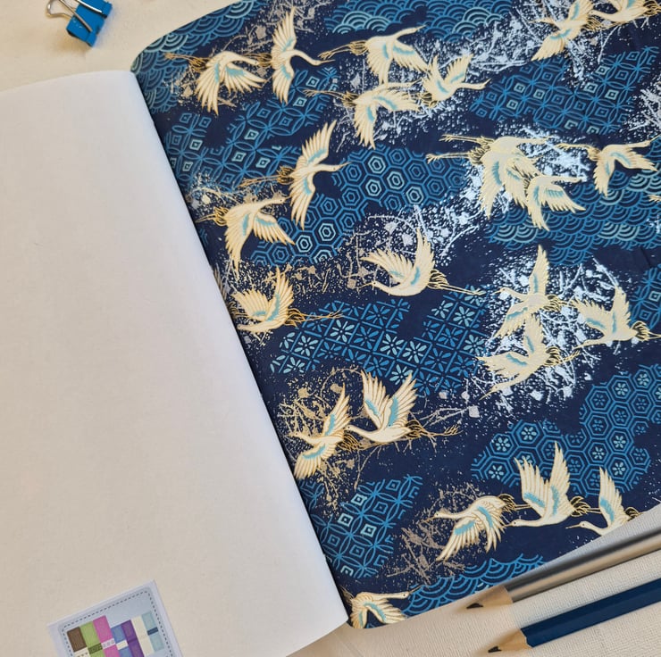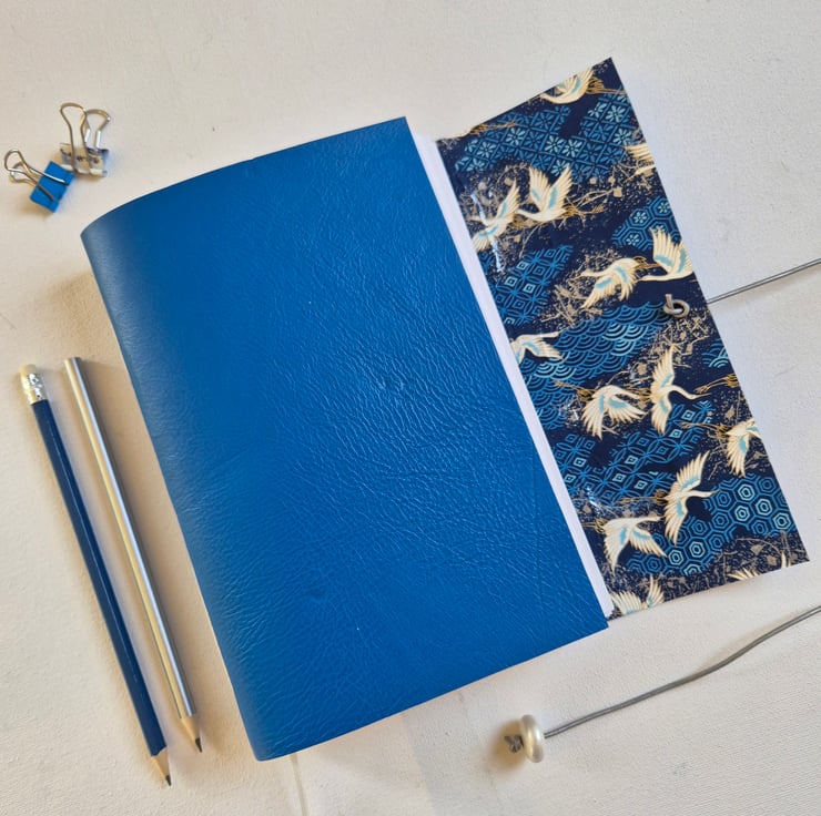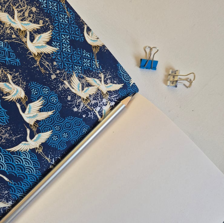 Beautiful Japanese Crane Journal, Sketchbook or Notebook, Hand Bound in Bright Blue Leather. The beautiful cranes flying on a background of pattern.