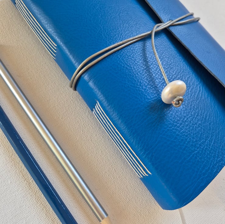 This Journal is A5 size and filled with 140 pages of 170gsm Cartridge Paper, perfect for Notes, Journaling, sketching, light watercolour. Can also be Bound with 200 pages of 100gsm Lined or Dotted Paper. The Journal is closed with a silver leather cord and finished with a wooden bead.