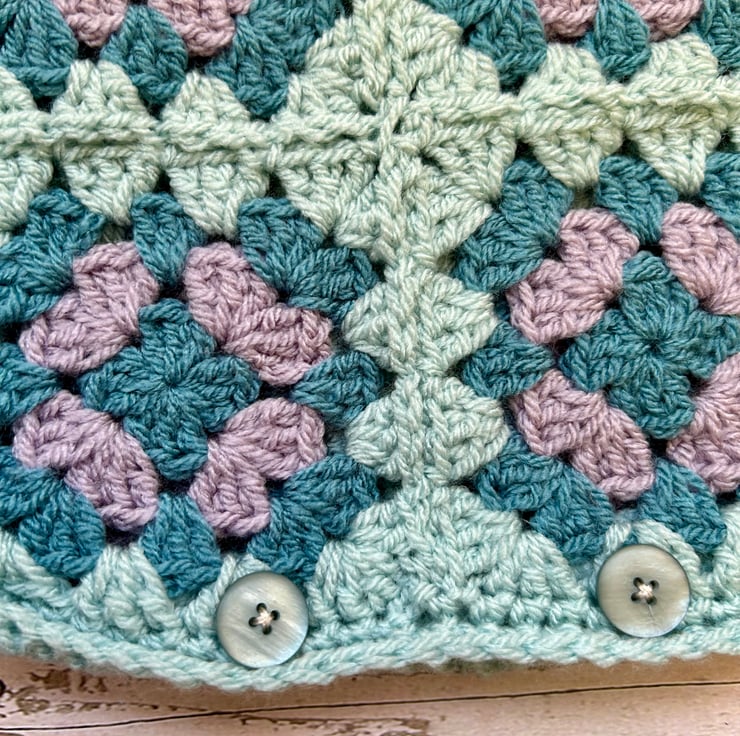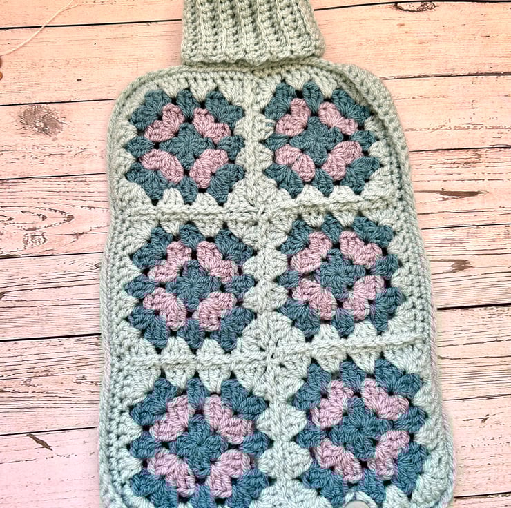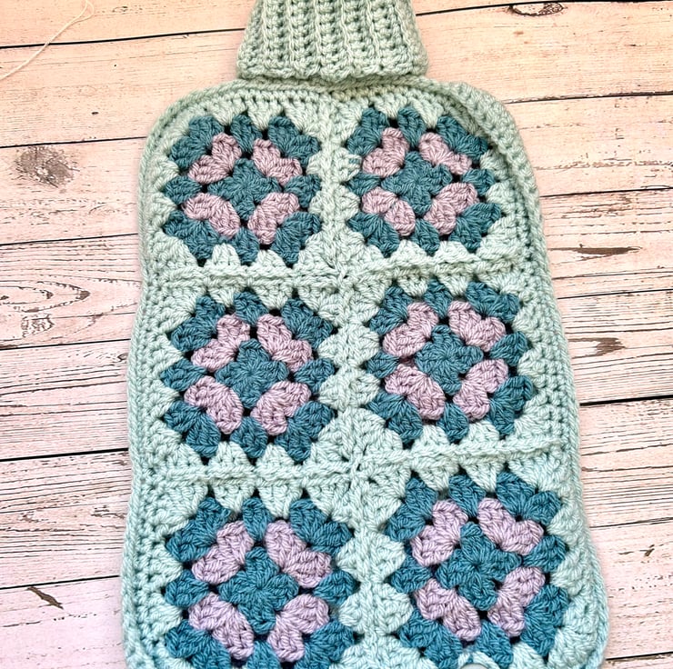 Handmade crochet granny square hot water bottle cover. Fits standard size hot water bottle.