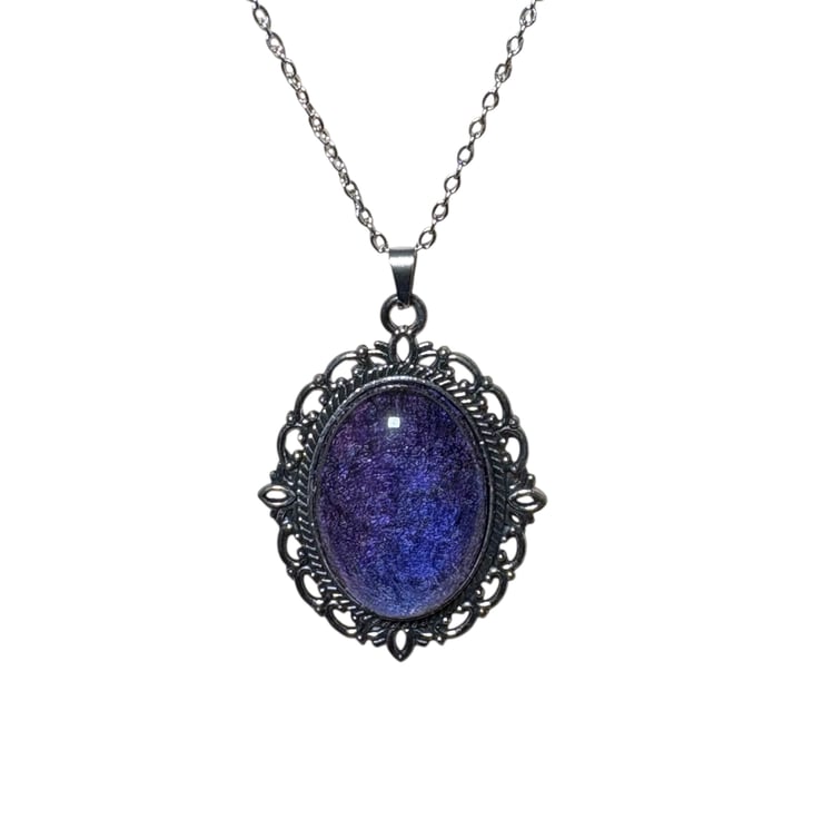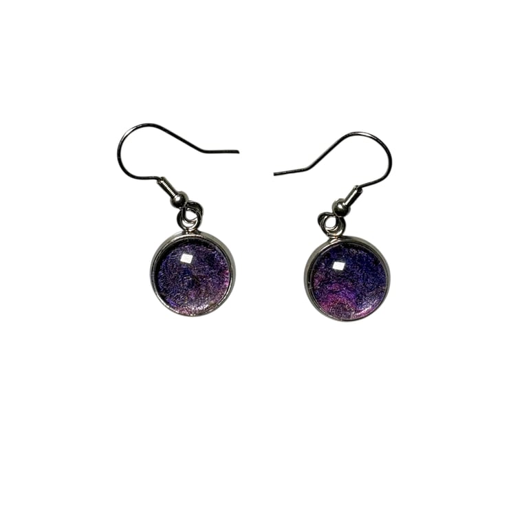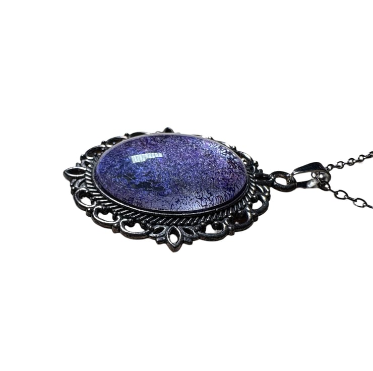 Deep purple handmade felt embellished with silk fibres has been used to make this unique, striking jewellery set. The set consists of an oval pendant and round drop earrings. Felt pieces have been mounted beneath a glass cabochon in a vintage style oval pendant tray for and round plain edged drop earrings. The glass cabochons enhance the colour and texture of the felt pieces beneath.