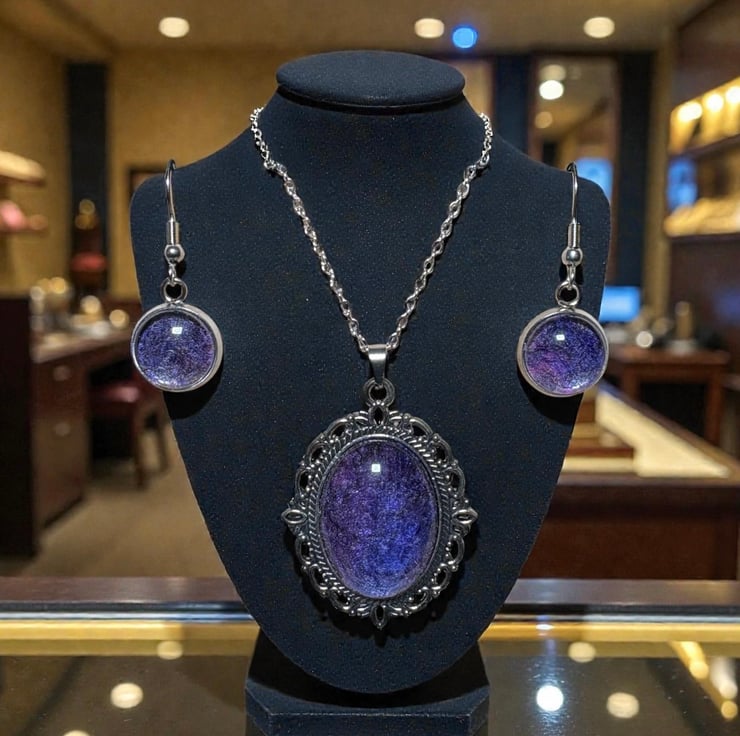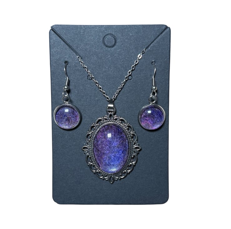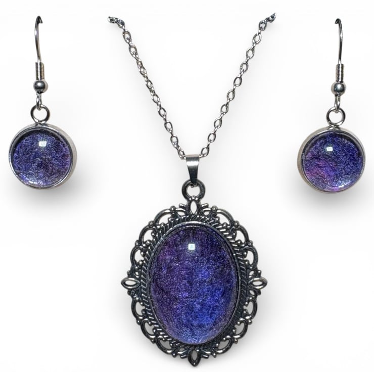 The pendant measures approximately 4cm x 3cm and is paired with an 18" silver tone chain with a lobster clasp while the earrings feature a 12mm circular tray attached to fish hook style fittings.