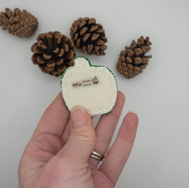 The finished brooch measures approximately 47 mm by 43 mm. A metal brooch bar is securely attached to the back so it can be worn on clothing, coats, scarves or bags.