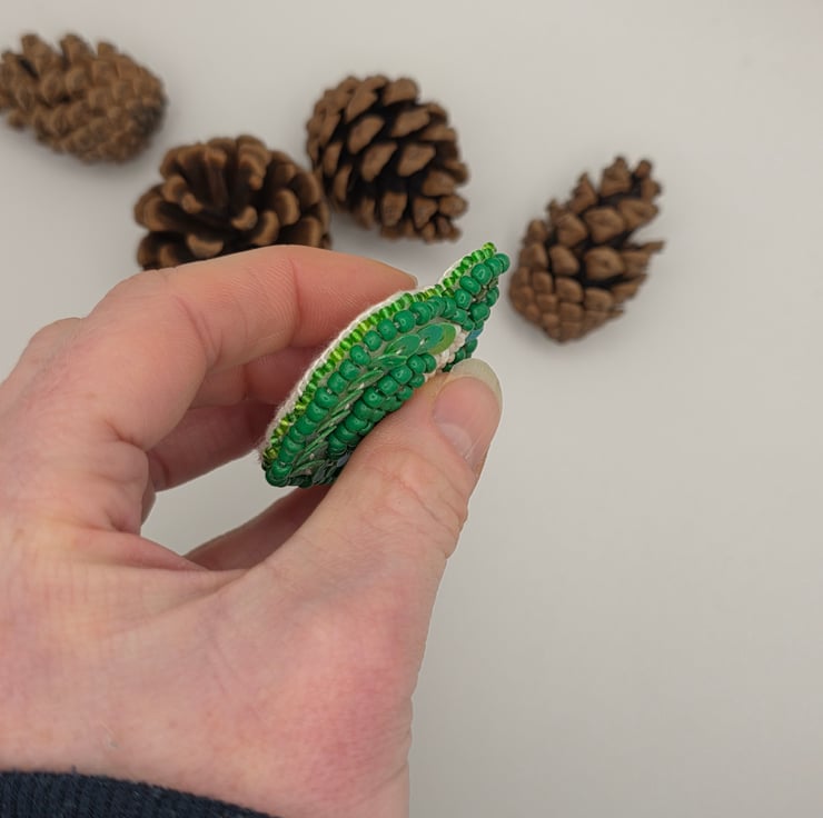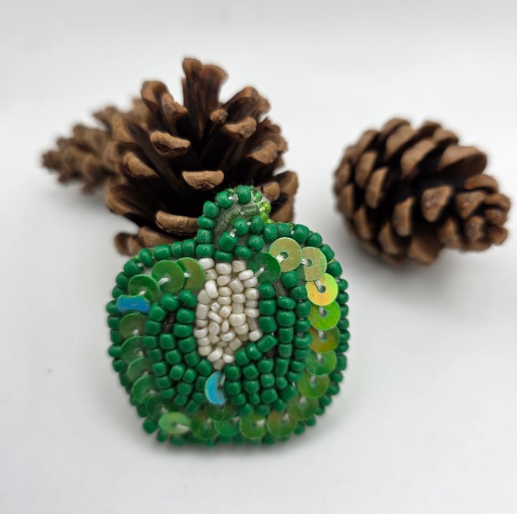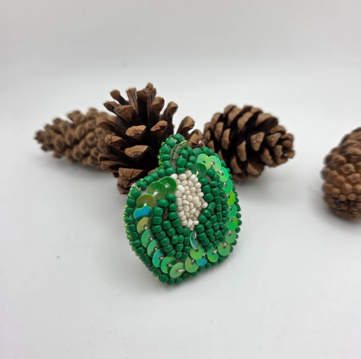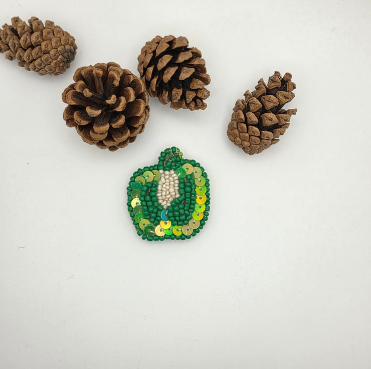 The design shows a green bell pepper sliced through the centre, revealing the pale interior and seeds. The outer pepper is stitched onto felt using green beads and sequins, giving it depth and a subtle shine. The centre is worked in off-white beads to represent the seeds and inner flesh, creating a soft contrast against the green. I like pieces that reward a closer look, and this one is all about texture and quiet detail.
