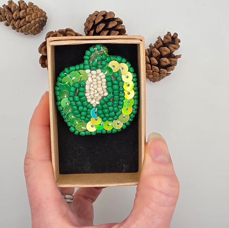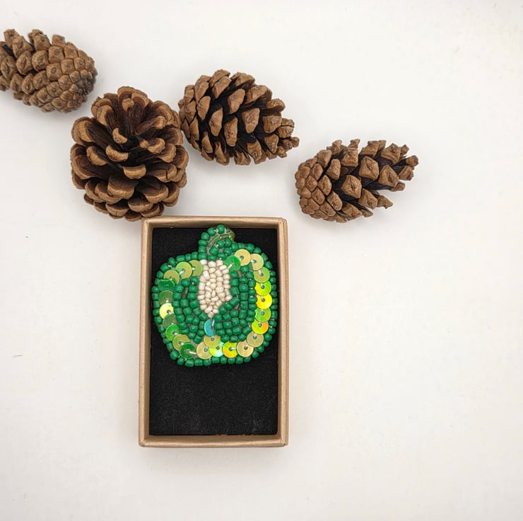 This hand embroidered green bell pepper brooch is an original piece of bead embroidery artwork, made by me in my Guernsey studio in the Channel Islands. I am a textile and mixed media artist with around twenty years of experience, and I enjoy turning everyday natural forms into small, wearable pieces of art.