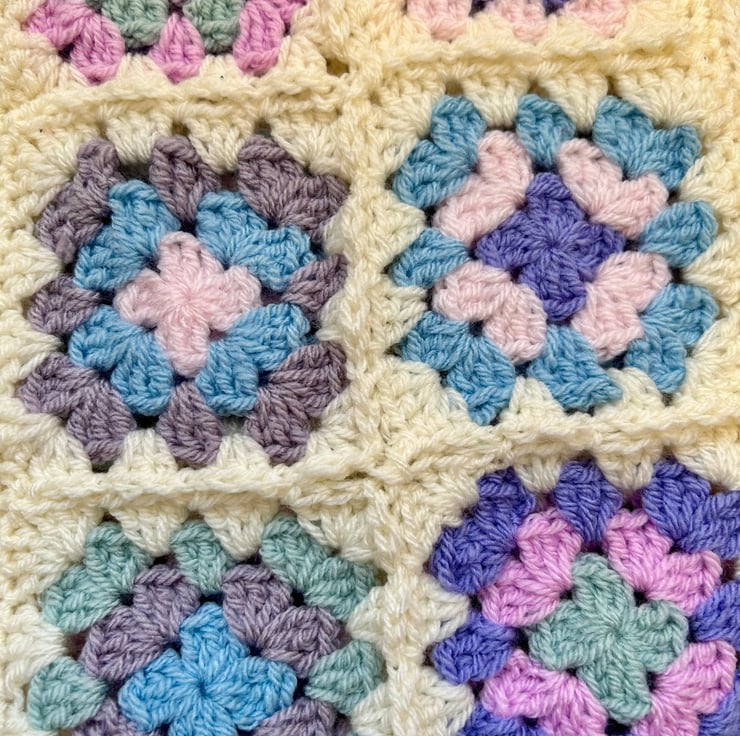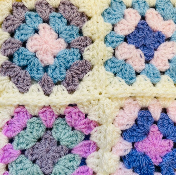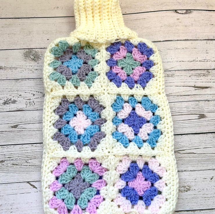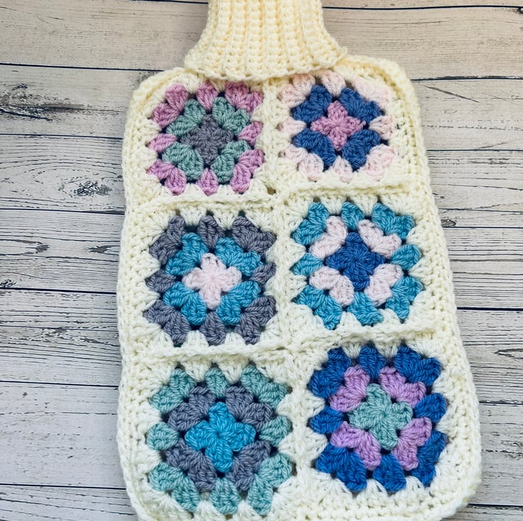 Handmade crochet granny square hot water bottle cover. Fits standard size hot water bottle.