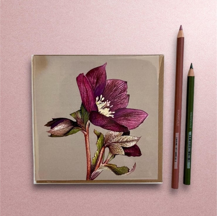 Original Artwork: This card showcases a delicate botanical study of the hellebore (also known as the Lenten Rose), meticulously captured from the artist's original drawing.