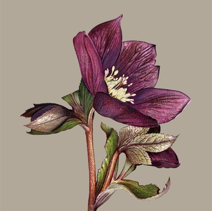 Botanical Detail: Known for their nodding heads and subtle beauty, the hellebore is depicted with a focus on its unique form and organic textures.