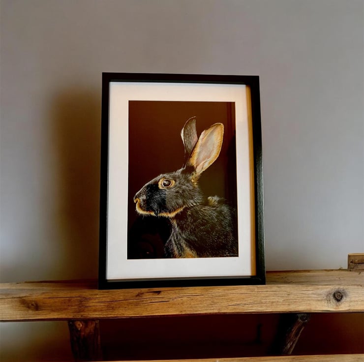 Printed on archival-grade, acid-free paper, this museum-quality reproduction uses lightfast pigment inks to mirror the rich textures and subtle tonal shifts of the original medium. Presented in a black contemporary wood and glass frame. Each stroke of the hare's sleek coat and the delicate transparency of its signature upright ears are preserved in stunning detail.