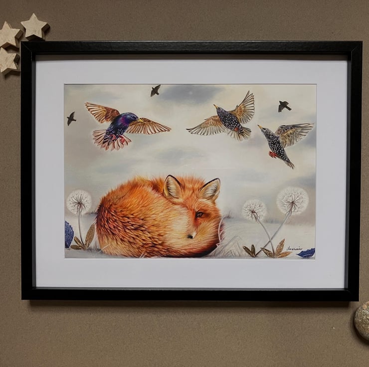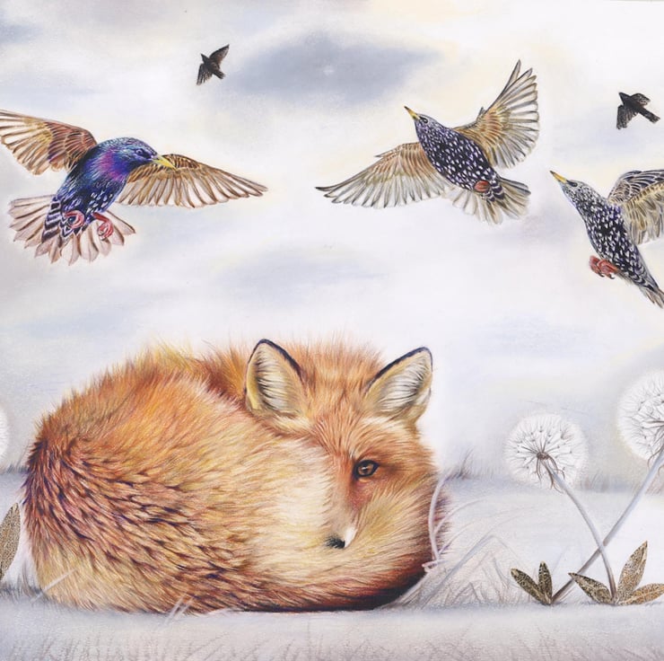 This elegant gicl e print captures a moment of serene connection with nature, reproducing an original drawing by artist Justine Williams. The portrait features a fox peacefully curled up embodying a sense of peaceful contemplation but still keeping one eye open to the world.