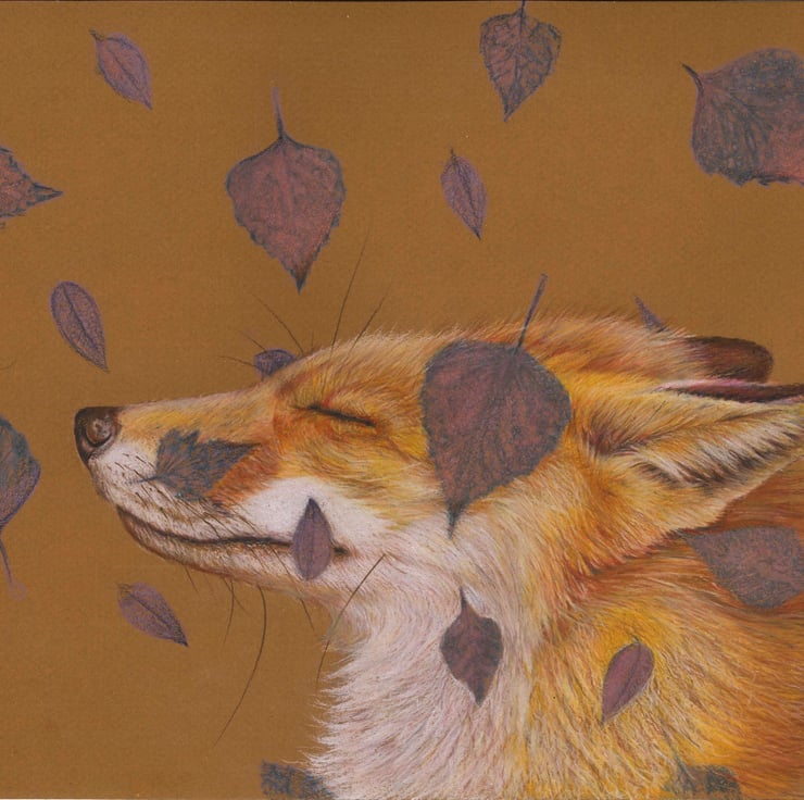 This evocative blank greeting card features a serene original drawing by artist Justine Williams, capturing a moment of pure, quiet joy in nature. The illustration portrays a beautiful fox with its head tilted blissfully upwards, eyes closed in contentment, as a cascade of delicate leaves drifts gently down around its face.