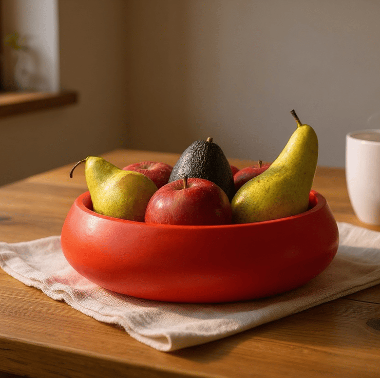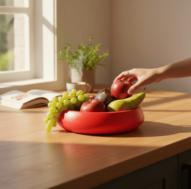 Bold colour has a way of changing the mood of a room. This red bowl is not meant to blend quietly into the background. It is designed to sit confidently at the centre of a table, catching the light and drawing the eye, whether it is filled with fruit or left empty as a statement piece.