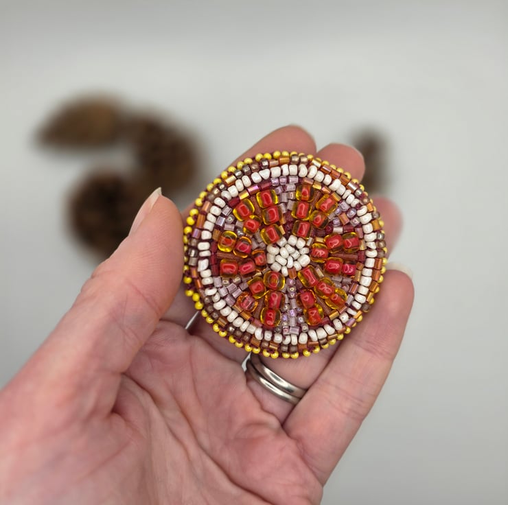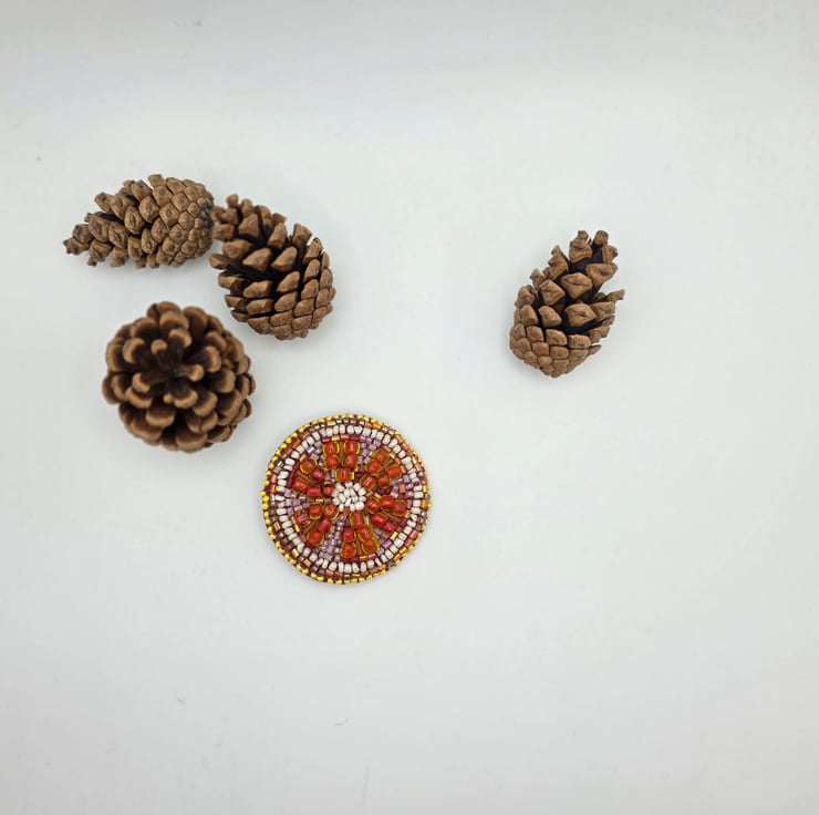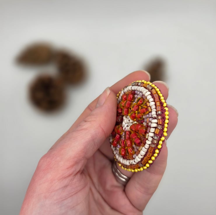 This circular grapefruit slice brooch is a hand embroidered beadwork piece, inspired by the colour and structure of a sliced piece of fruit. It is made by me in my Guernsey studio in the Channel Islands, where I work with textiles and mixed media, focusing on slow, detailed processes developed over many years of practice.