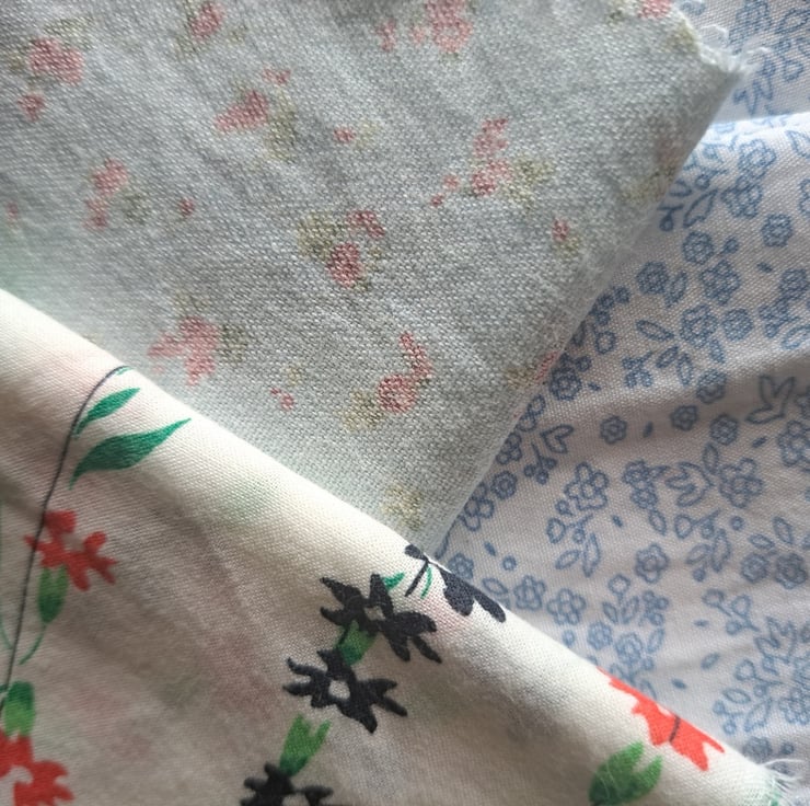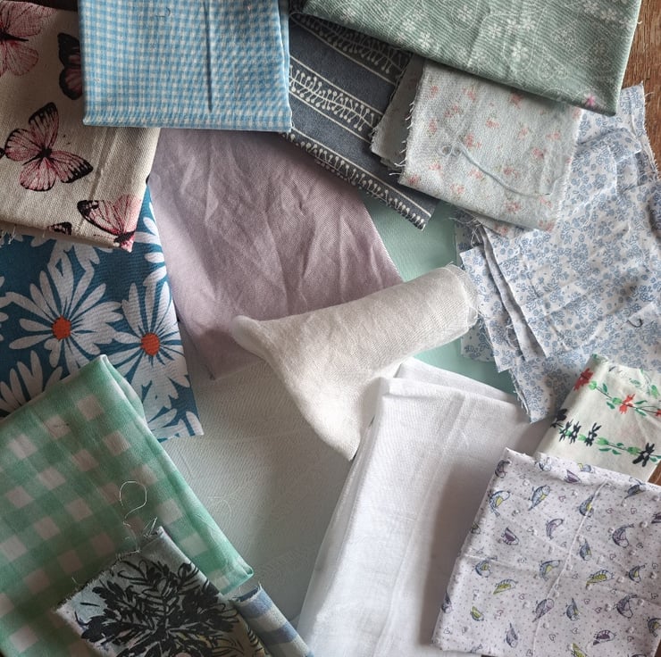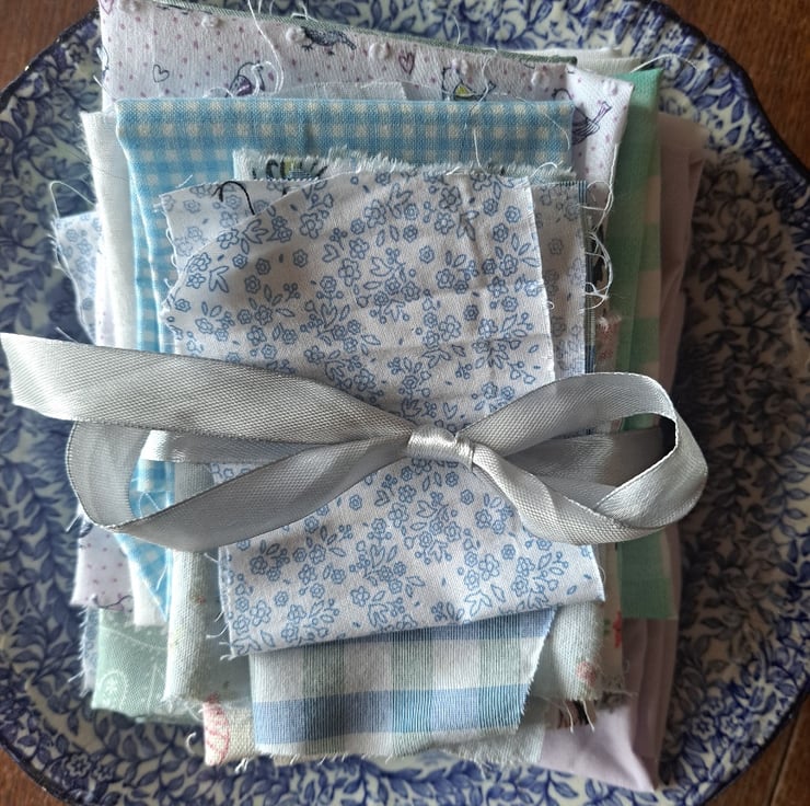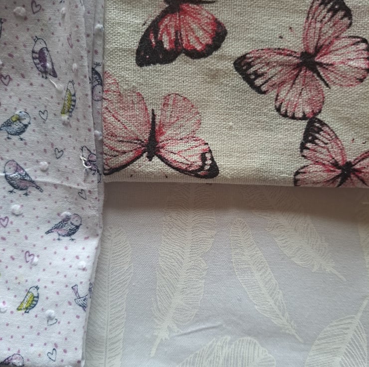 A breezy bundle of 17 pieces of new, vintage, rescued and repurposed cotton and linen fabric pieces of all sizes to blow away the crafting cobwebs. Whites and pale blues are the order of the day, with some birds, butterflies and feathers passing through.