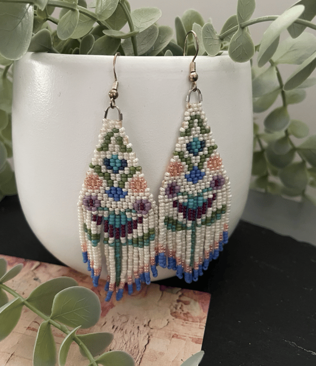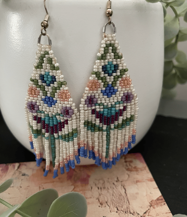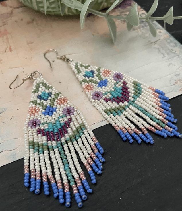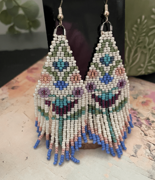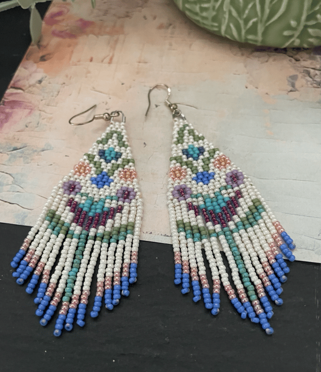 Beautiful unique folk art flower fringe earrings hand threaded using high class quality Miyuki glass seed beads from Japan. Designed and created in my little studio in the Kent countryside these light weight swishy earrings are an eye catching and lovely accessory, perfect for a gift or to keep.