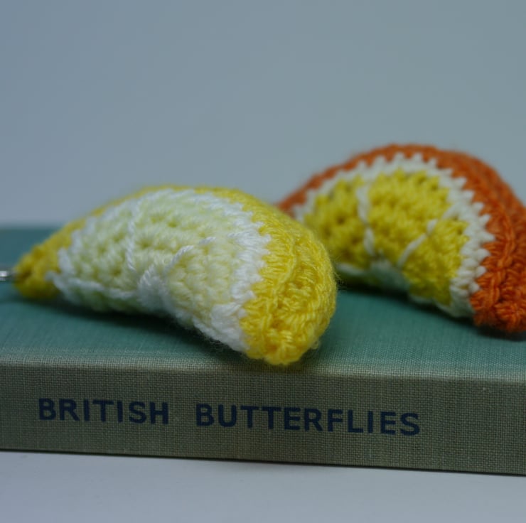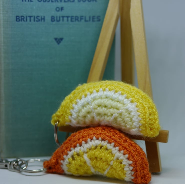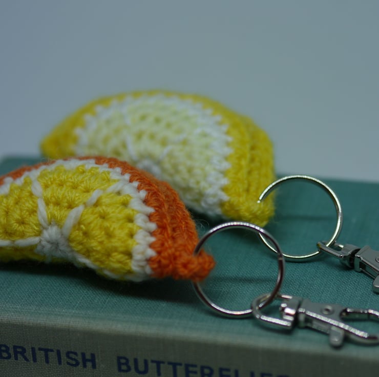 Crochet Orange and lemon slice keyring charms, this crocheted keyring pair are made from soft acrylic wool in Orange, yellows and cream with stitched segment detailing. They have keyring clips attached comprising of a split ring and swivel lobster clasp making them a versatile accessory. Measuring approximately 3 inches (8cm) by 1.5 inches (4cm). They are a comfortable size to fit in your hand and the soft hollowfiber stuffing gives a tactile squishy feel. Use these quirky accessories to keep your keys safe or clip it to a bag as a fun and fruity accent. Also makes a great gift. Created in a smoke and pet free home, designed as an accessory not a toy.