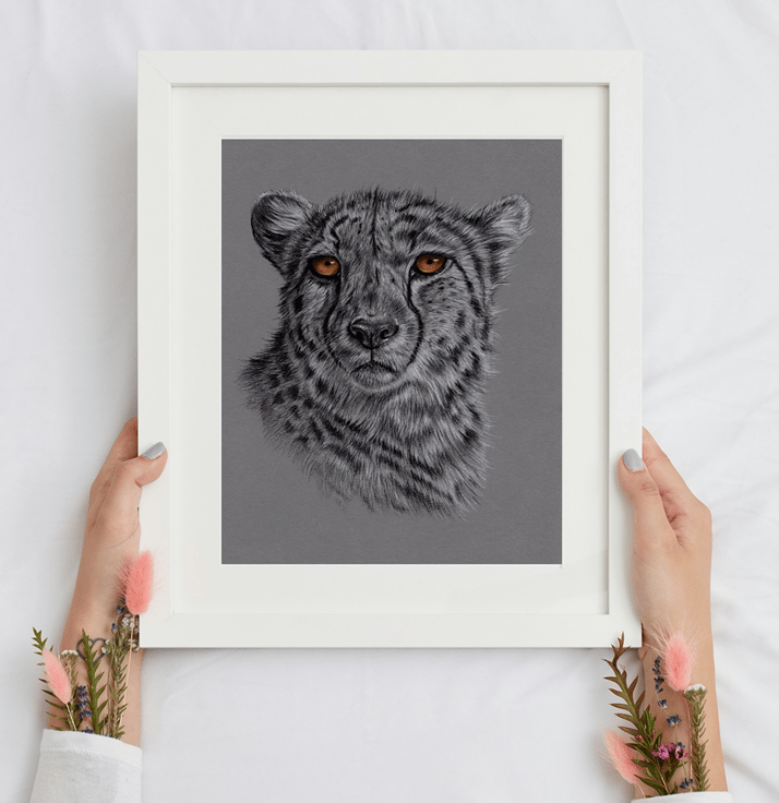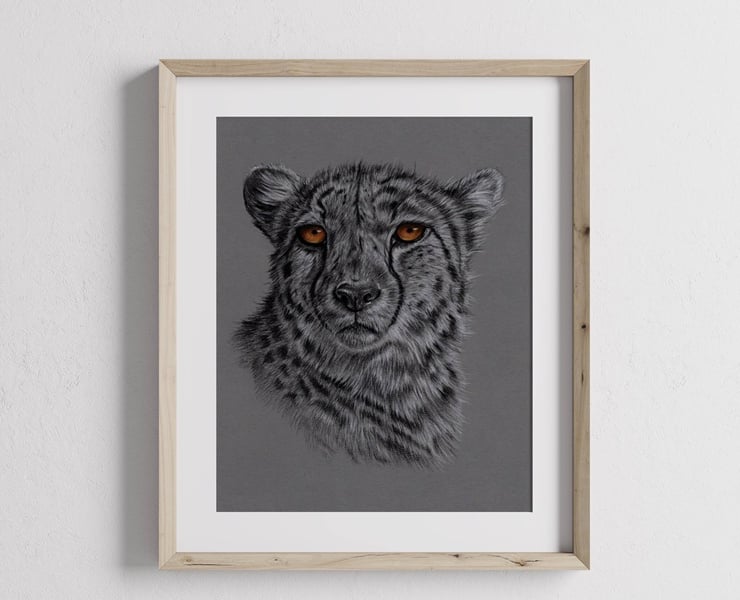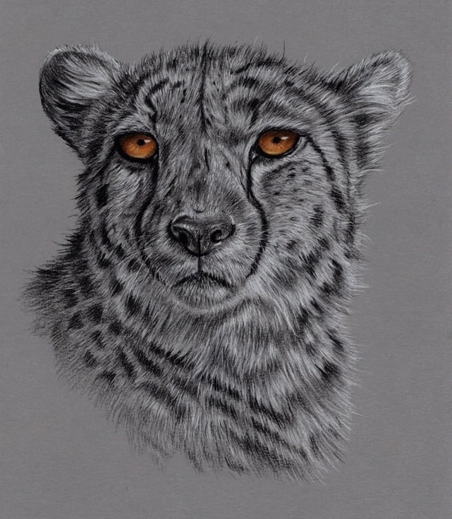 An original work of art. A unique gift for any animal lover. This is a charcoal drawing of a cheetah. Charcoal on grey-toned paper. A one-of-a-kind artwork.