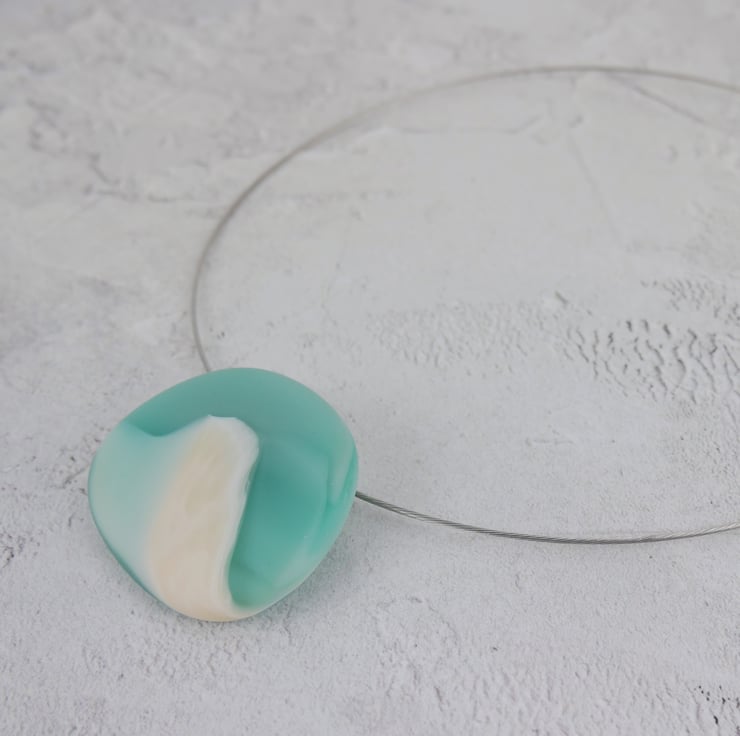 The large pebble shaped glass pendant has an irresistibly tactile matt surface just like seaglass. It hangs from an unobtrusive stainless steel choker via a curved 'invisible' bail, which means that the pendant almost appears to float when worn - it's a very neat look. The necklace comes complete with a gift box, ready to give as a gift.