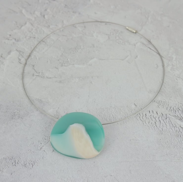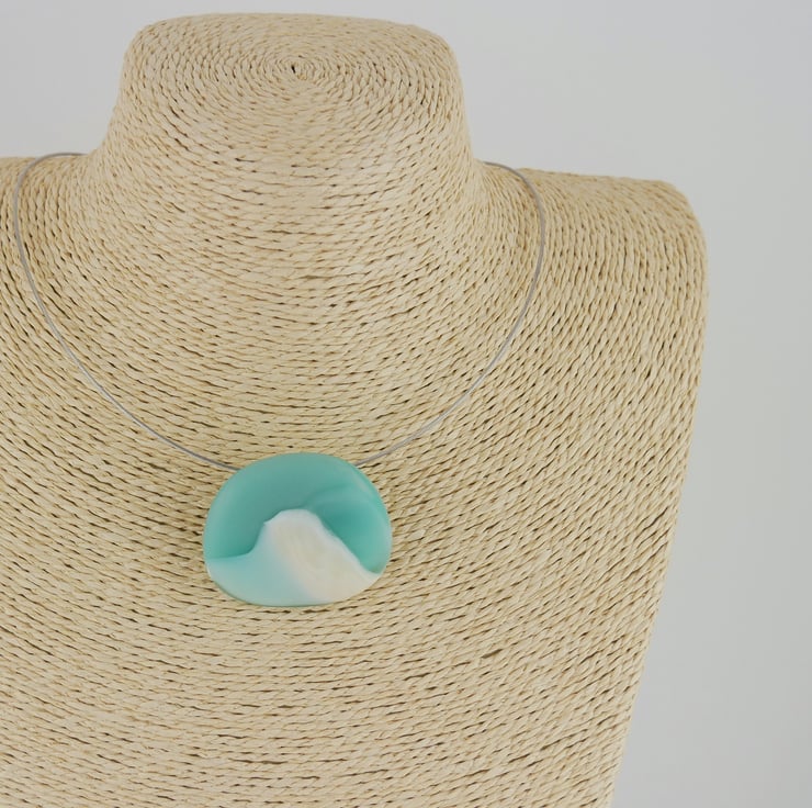 A smooth satin finish fused glass pendant with creamy white glass lapping over shades of pale turquoise and seafoam blue - think shallow waves tumbling over silvery sand.