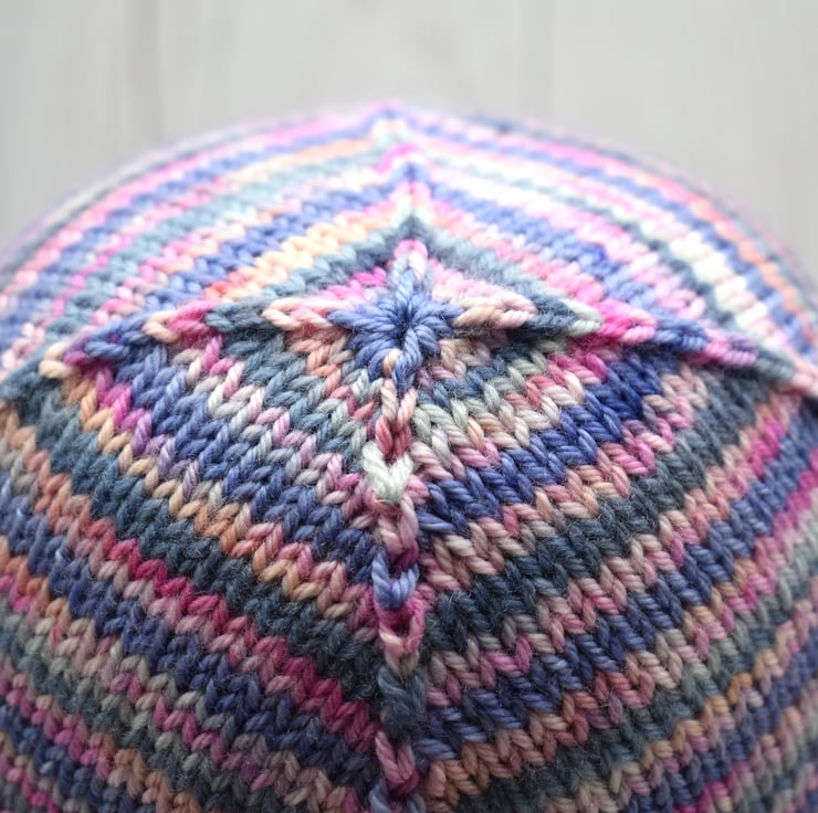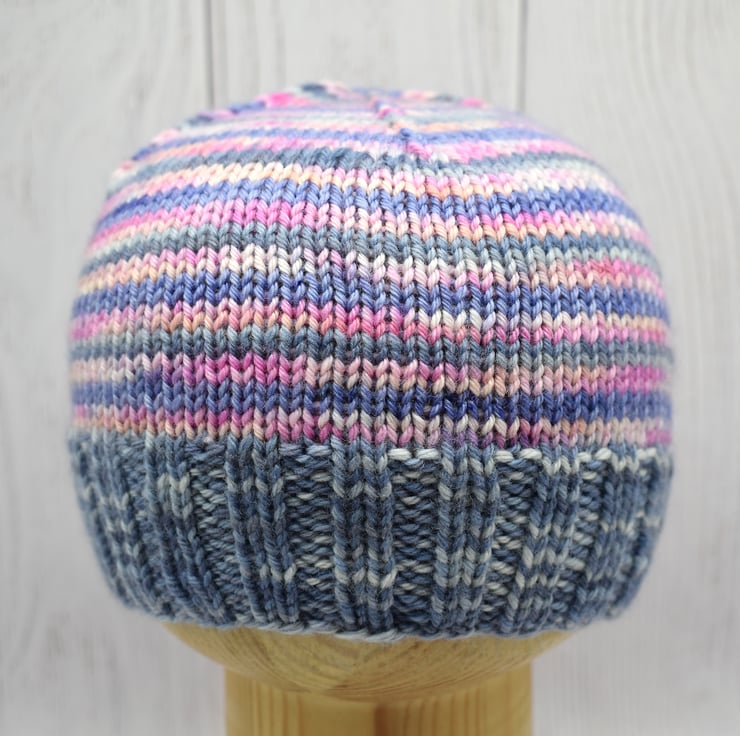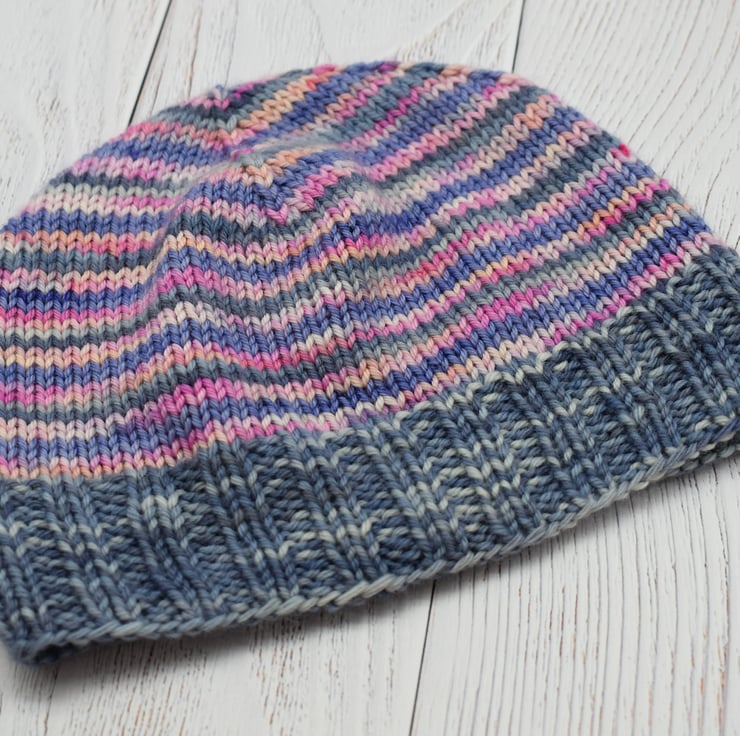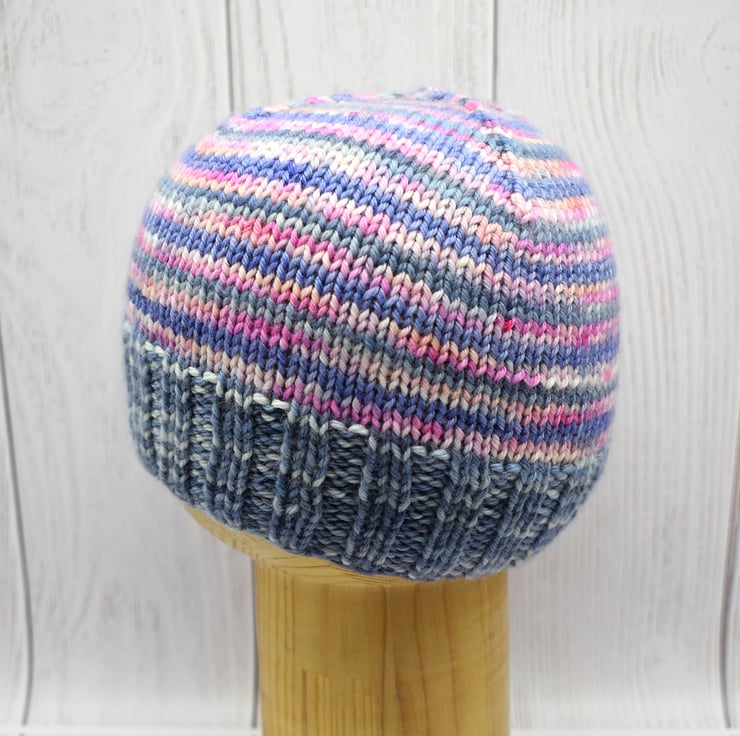 This toddler-sized hat has been hand knitted in a lovely soft superwash merino and nylon blend yarn, creating a cosy and comfortable accessory for little heads. The gentle stripes in pinks, blues and purples add a cheerful splash of colour while still being easy to wear with lots of outfits.