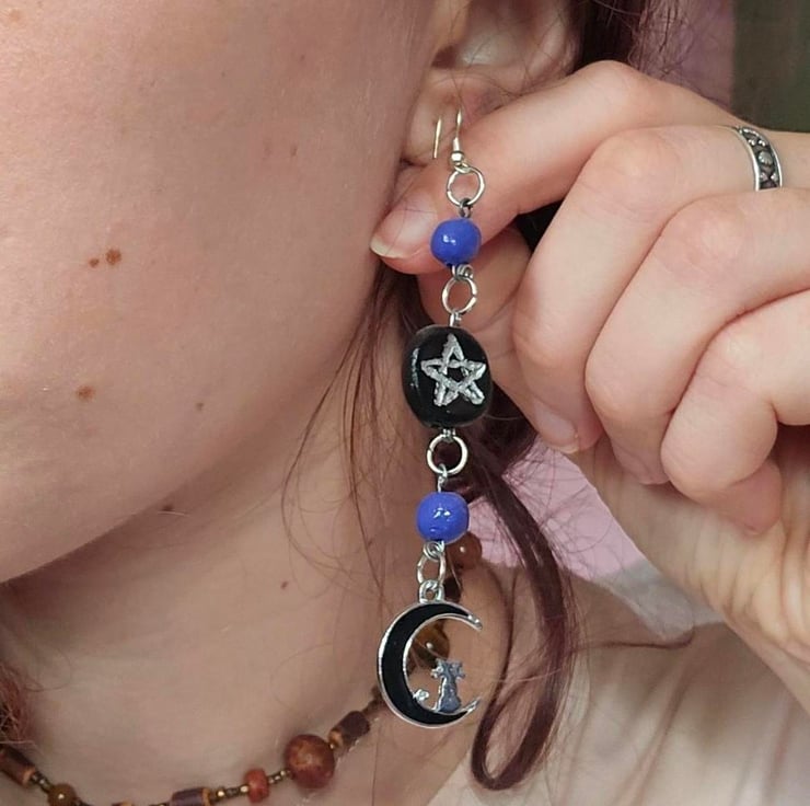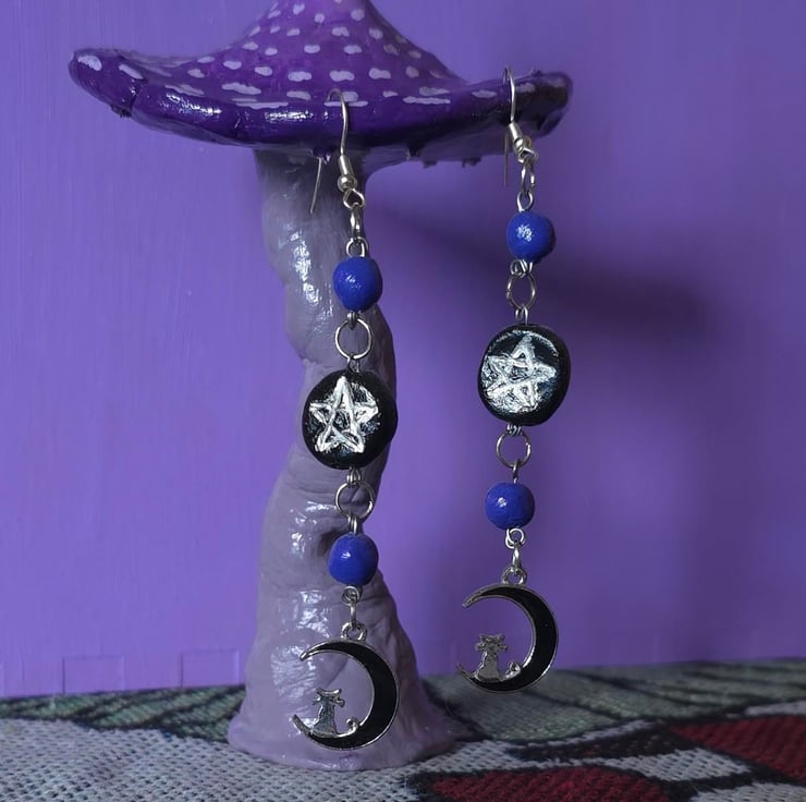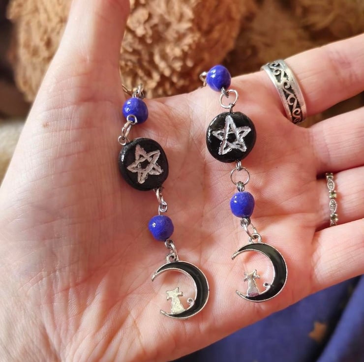 handmade pentagram earrings with cat on the moon charms