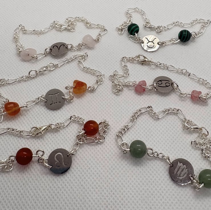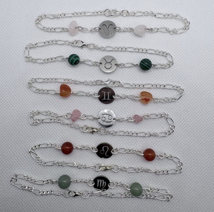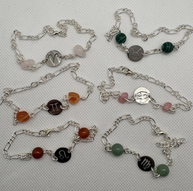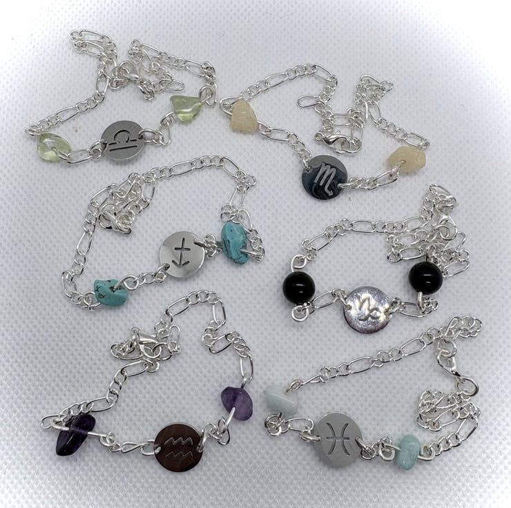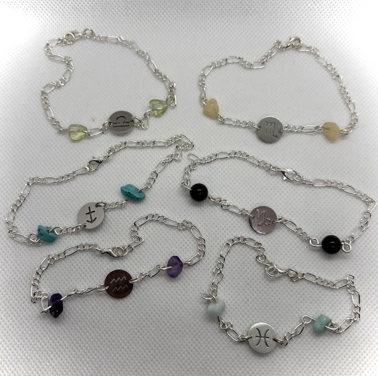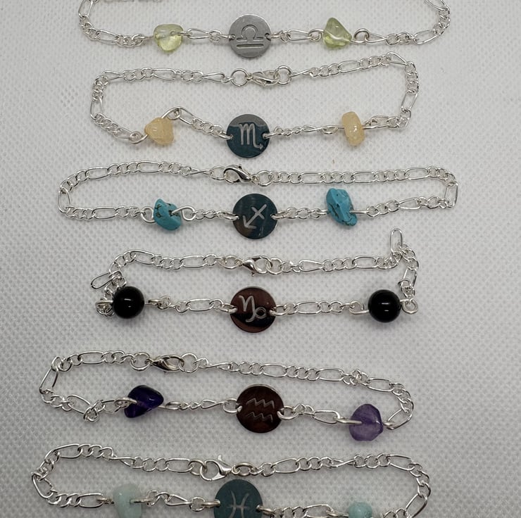 Handmade wire wrapped zodiac bracelets made with stainless steel zodiac symbol discs and semi-precious gem stones and beads.