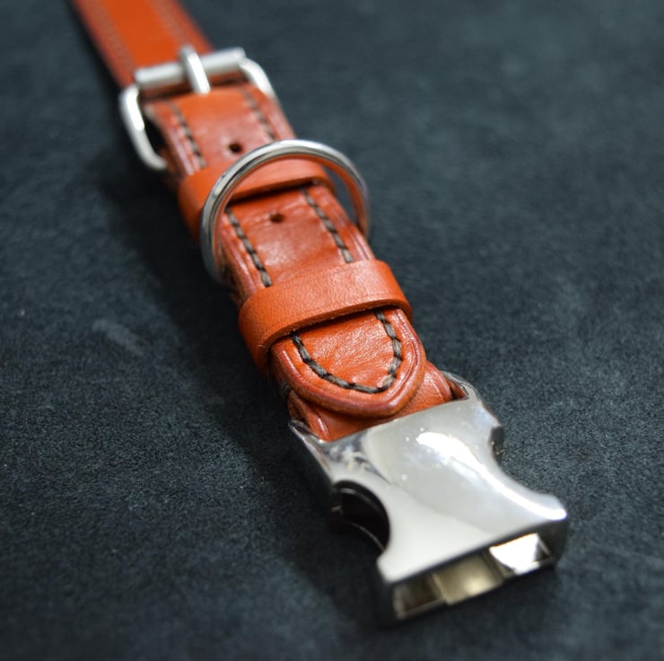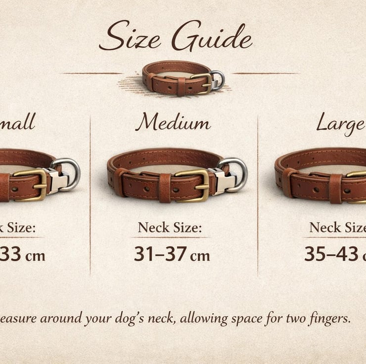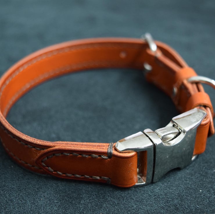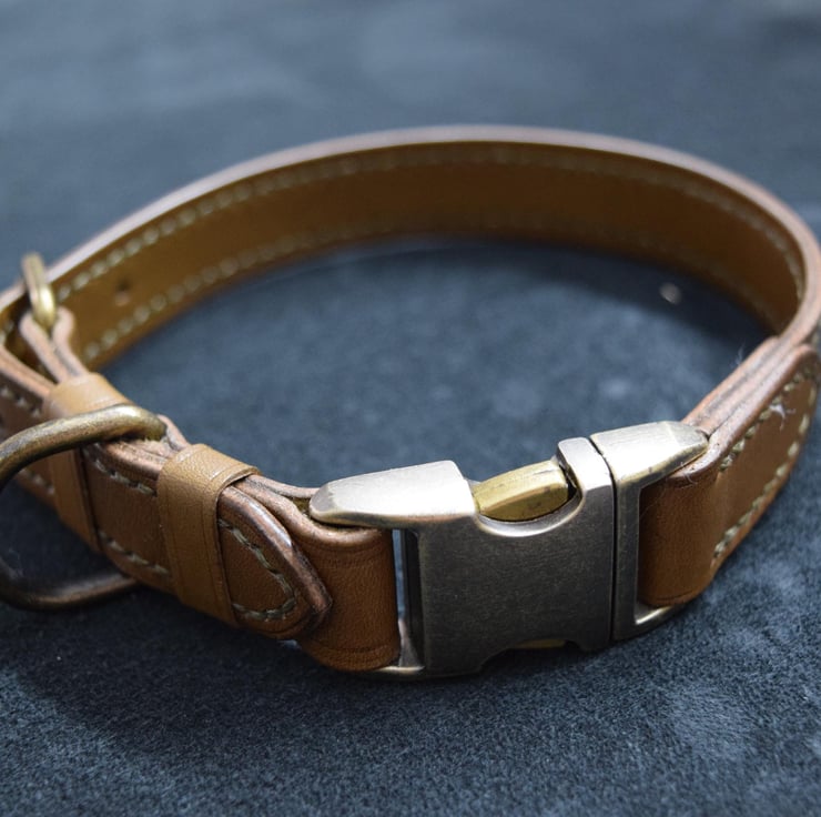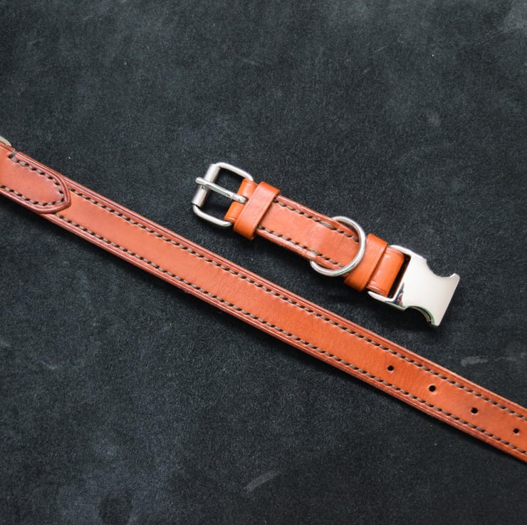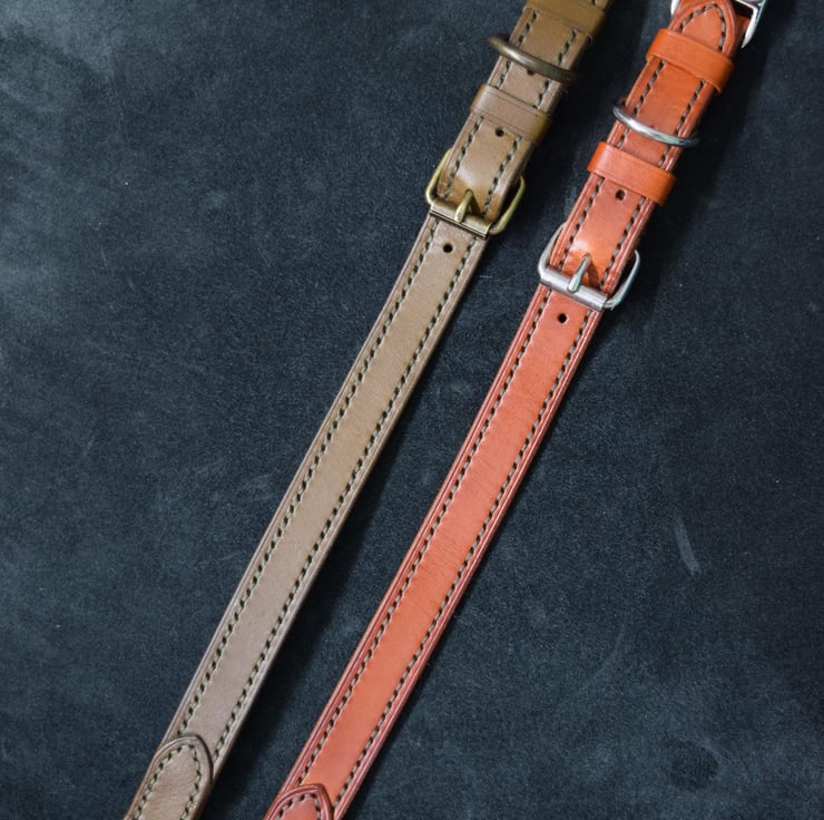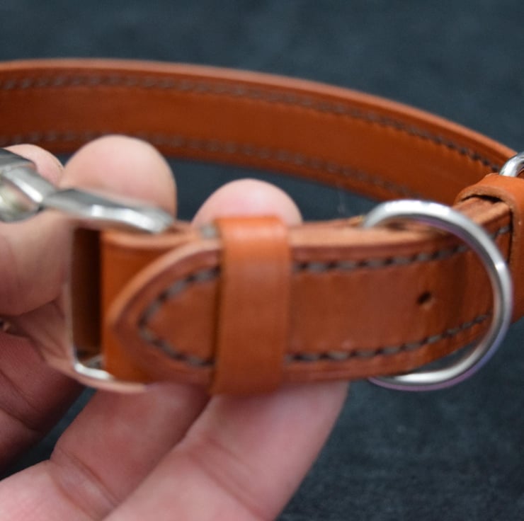 The collar is finished with the grain side of the leather on the outside, providing strength, durability, and a clean, timeless appearance. Without padding, the collar remains light and flexible, moulding naturally to your dog’s neck as it softens.