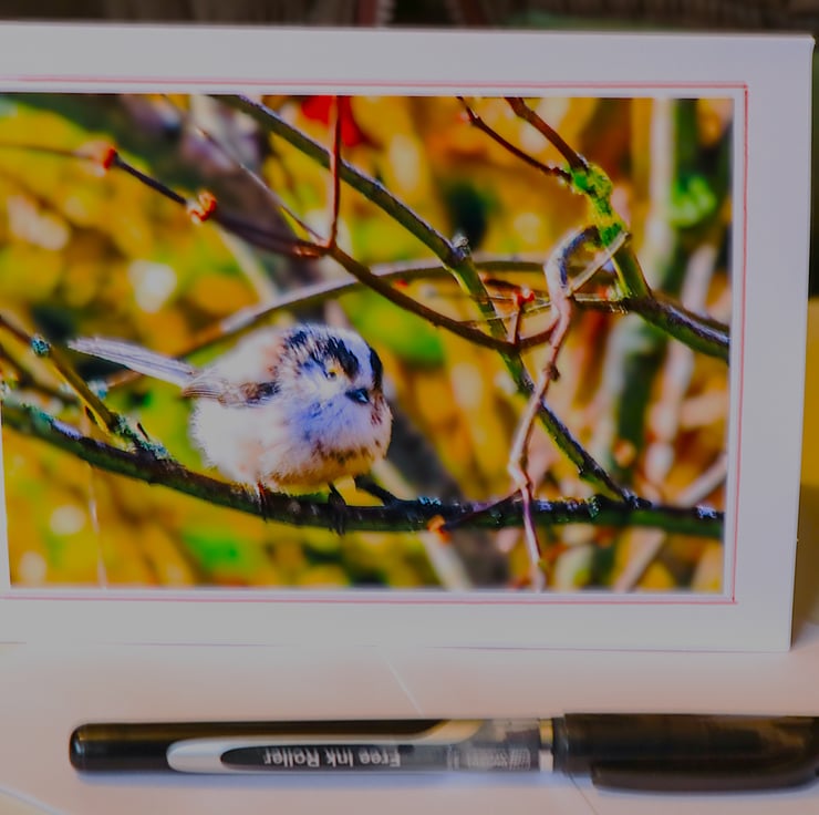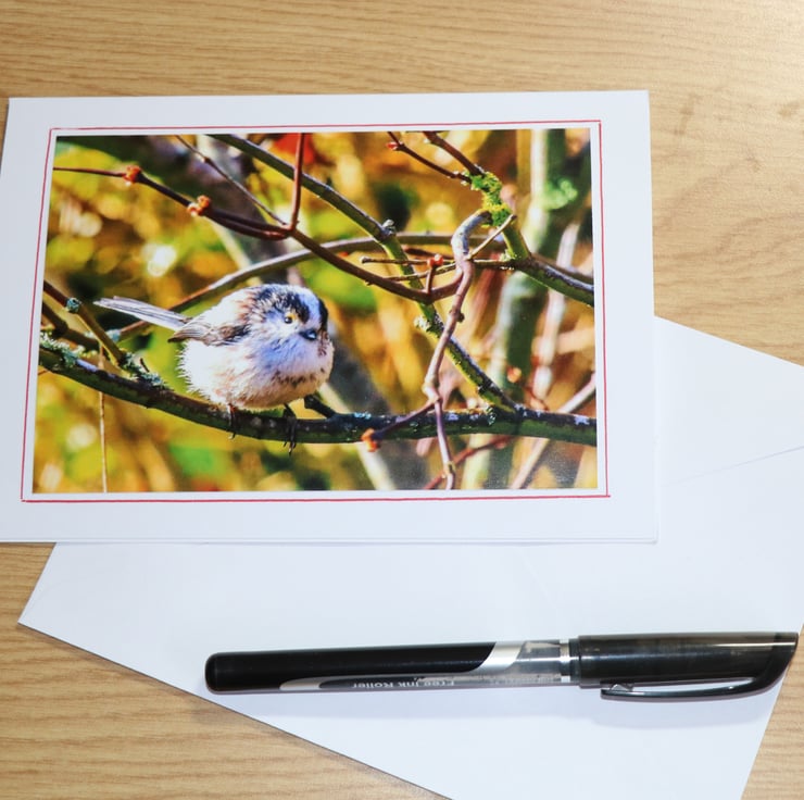 Admire the delight of garden birds with this art card featuring an original photograph of a Long Tail Tit busy feeding in the garden. Always part of a larger family group, and never very still for long.. Printed on high-quality card stock, blank inside for your own message. Perfect for birthdays, thank-yous, or seasonal notes. Comes with a plain white envelope.
