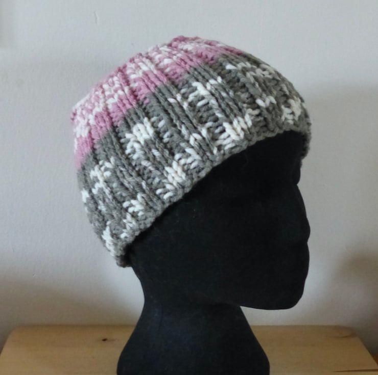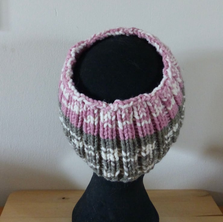 A hand knitted headband in a chunky 'Nordic' style yarn which is 20% Merino Wool and 80% Acrylic so is lovely and soft and cosy. The colours are Light Brown, Pink and Off-White.