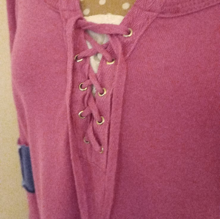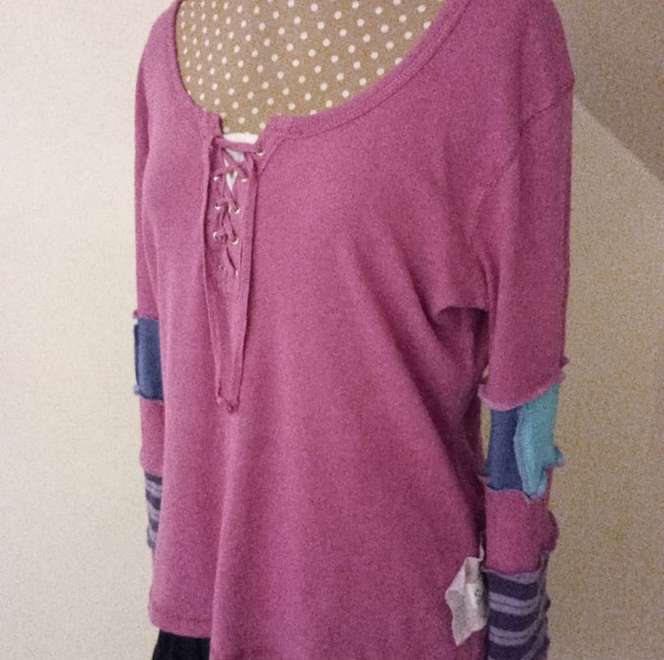 This patchwork top is made entirely from preloved materials. This whimsical wonder features a little corset-style lacing at the front and patchworked sleeves with exposed stitching. It's a wonderful piece of wardrobe whimsy.