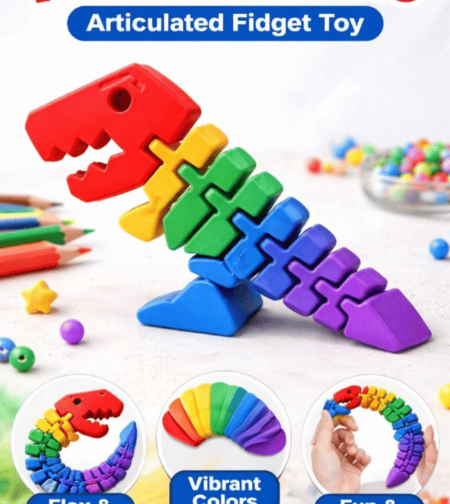 This articulated dinosaur fidget toy is designed to be fun, flexible, and visually striking. Made as a fully poseable segmented model, it can be bent, twisted, and displayed in a variety of positions, making it perfect as a fidget toy, desk companion, or shelf display.