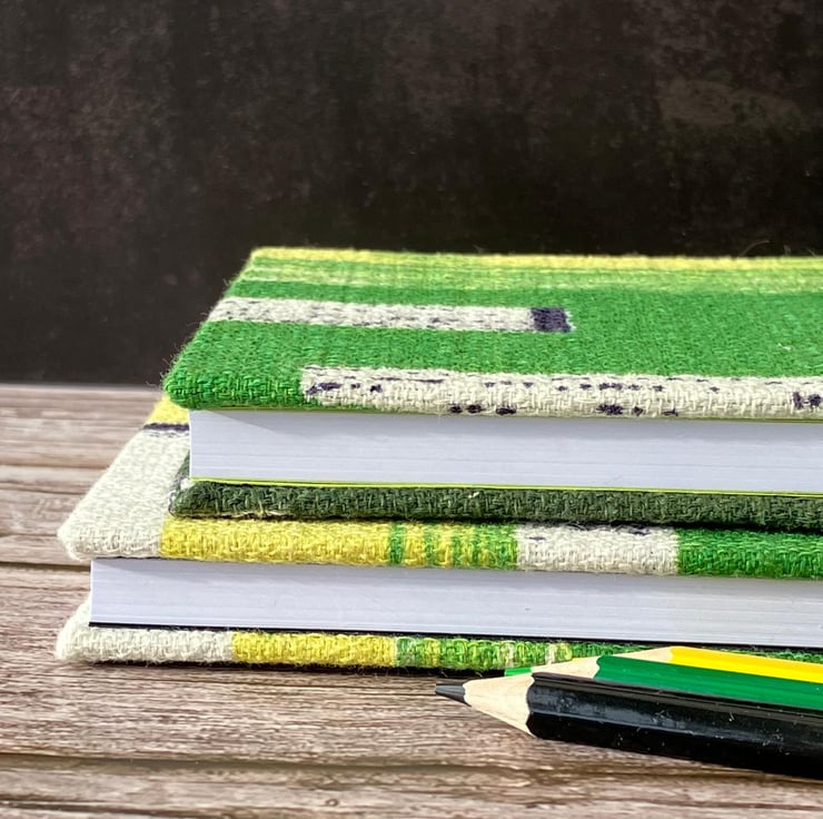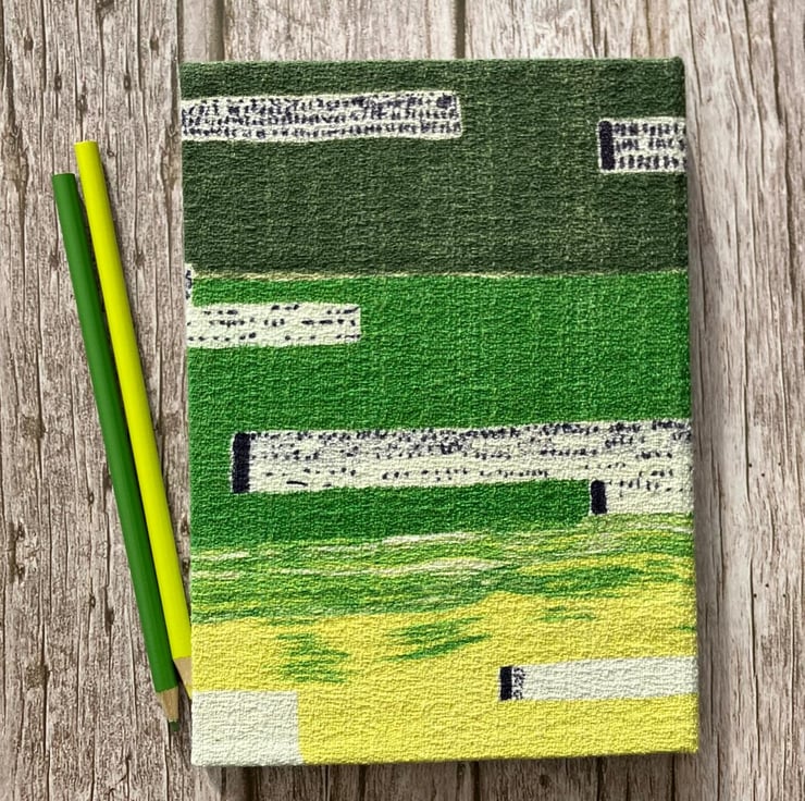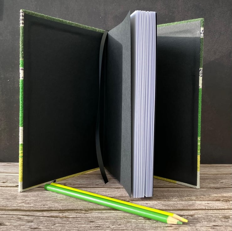 Every book I make includes a ribbon bookmark and coloured end-papers made from high quality Canford or Canson paper, hand picked to match one of the colours in the fabric design. This book has a black satin ribbon and matching Canford Paper end papers which really make the green's pop.