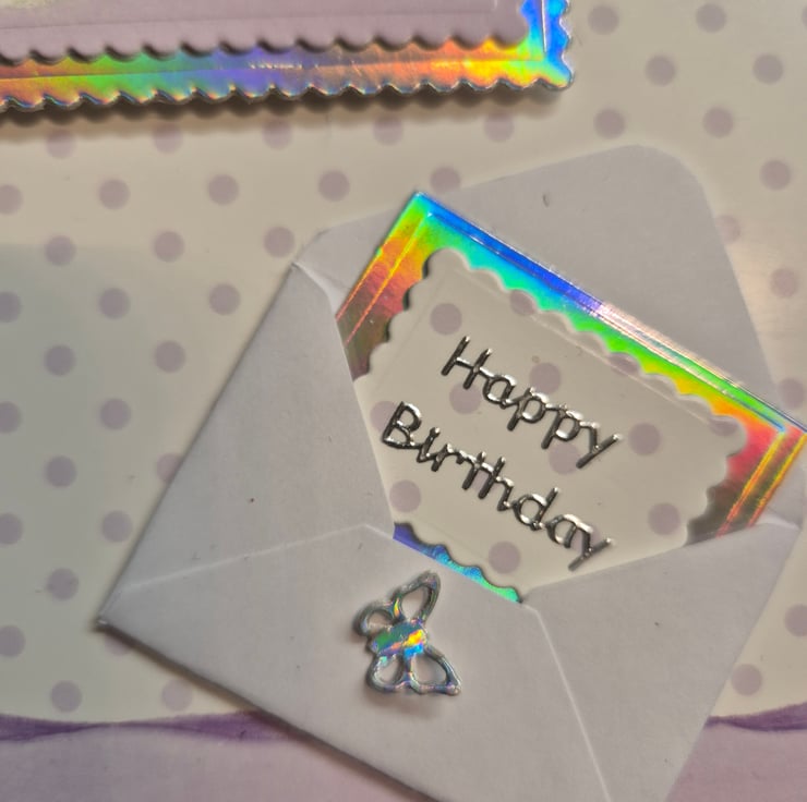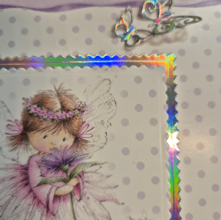 Childs fairy birthday card. The topper is trimmed with holographic card which shows up very colourful in the pictures. There are 3 holographic butterflies, a mini envelope and card with the words happy Birthday.