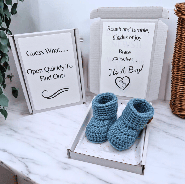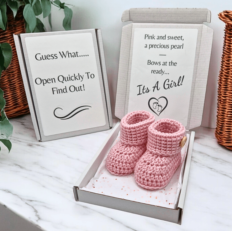 Share your exciting news in a thoughtful and memorable way with this handmade crochet baby booties gender reveal gift. A lovely keepsake for announcing your pregnancy or revealing your baby’s gender to family, friends, or loved ones.