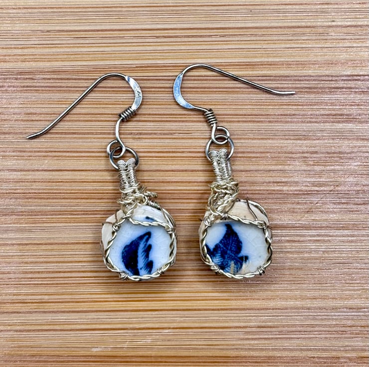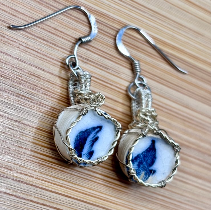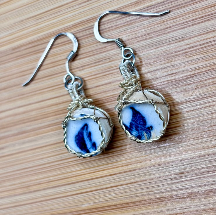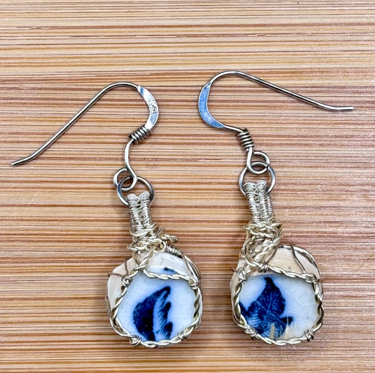 Scottish sea pottery earrings - Sterling Silver fish hooks - Unique blue & white