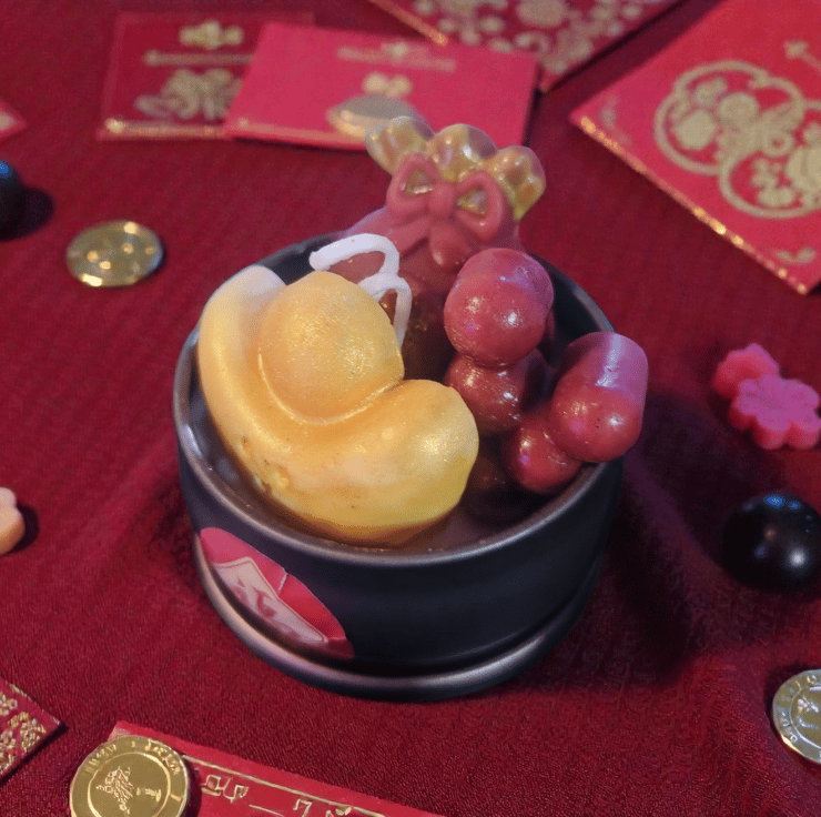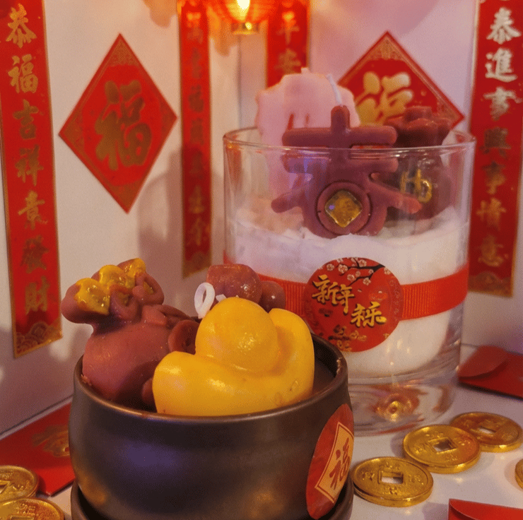 The candle itself features a large golden ingot-shaped wax piece at its center (a classic symbol of abundance), surrounded by rich brown and red Rock Sugar Gourd wax accents and Money Bag decorative details. Paired with festive elements like red lanterns, gold coins, paper fans, and zodiac-themed cutouts, it’s a beautiful decorative piece for the holiday. When lit, it emits a warm glow that adds to the joyful, celebratory ambiance of the season, and makes a thoughtful gift to share New Year wishes with family and friends.