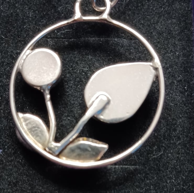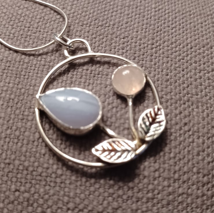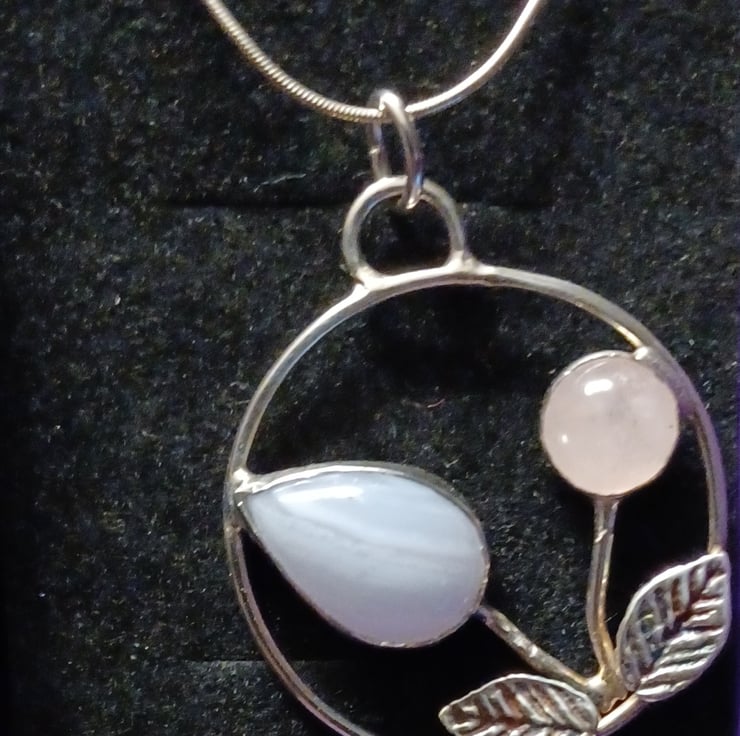 A pretty handmade pendant: two flowers, one with a blue lace agate cabochon flower and one with a rose quartz cabochon flower rest on a 3cm circle of sterling silver. Two leaves in sterling silver complete the flowers. The pendant is attached to a 45cm (18") sterling silver snake chain, fastened with a bolt clasp.