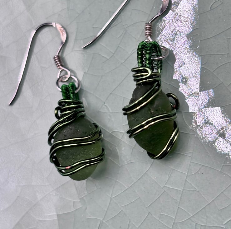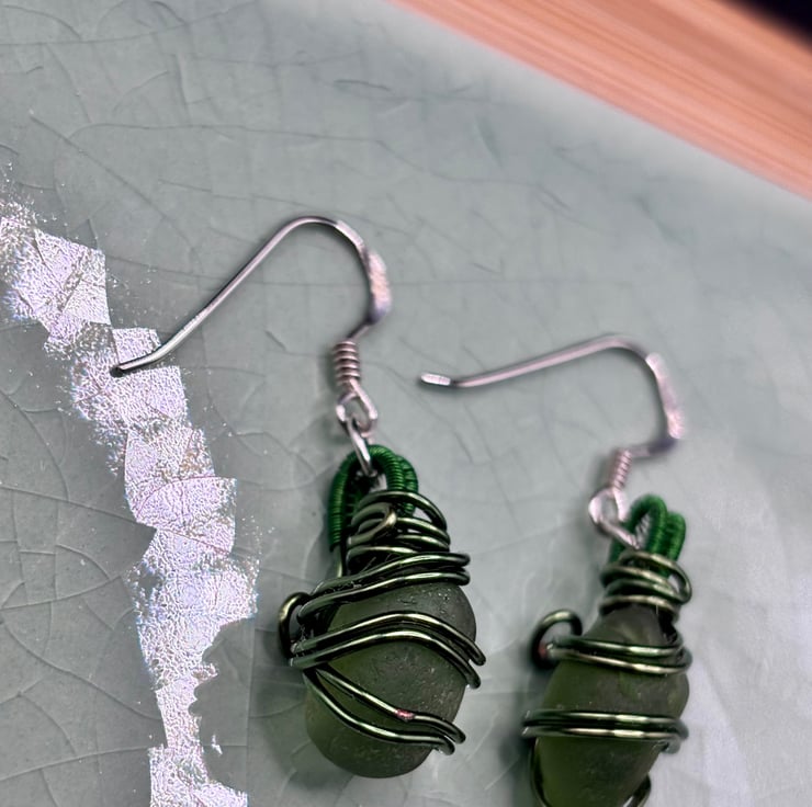 We have created a beautiful pair of Scottish green sea glass earrings. The fish hooks are Sterling Silver. The sea glass wrapped using enamelled copper jewellery wire. They will look absolutely gorgeous all year round!