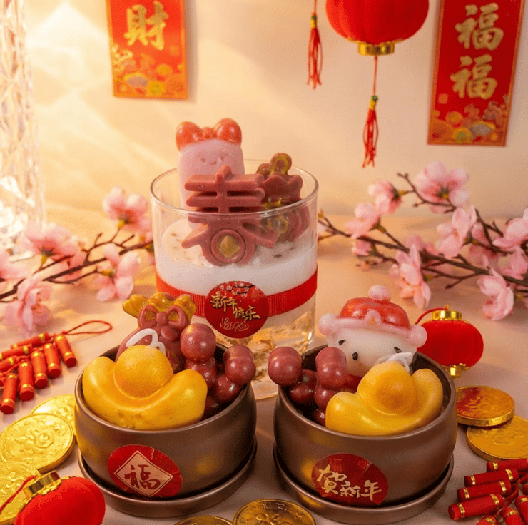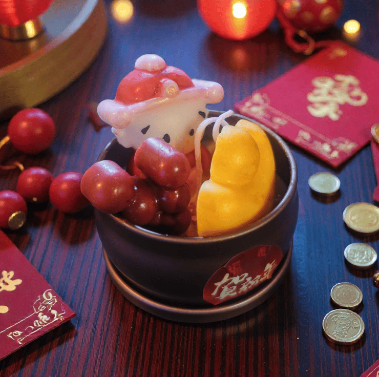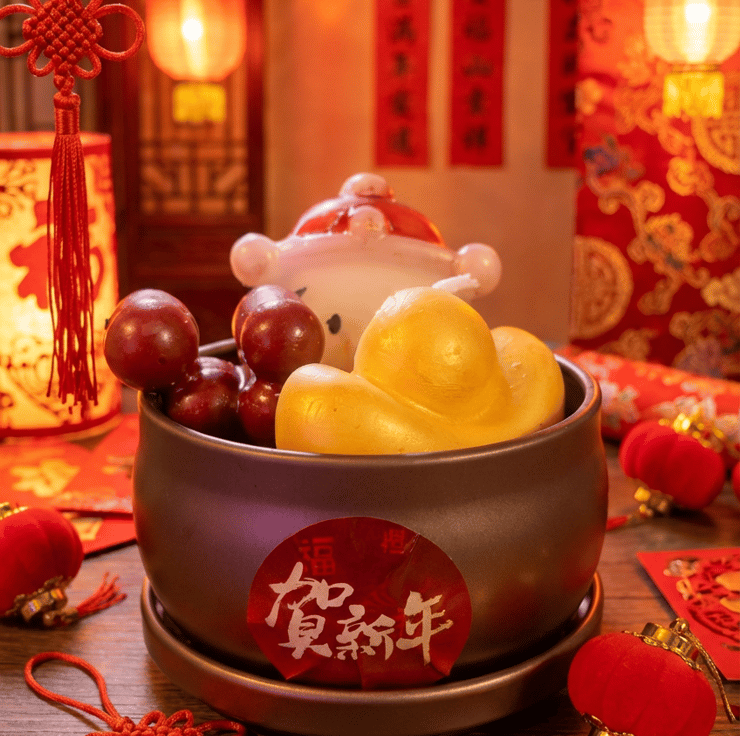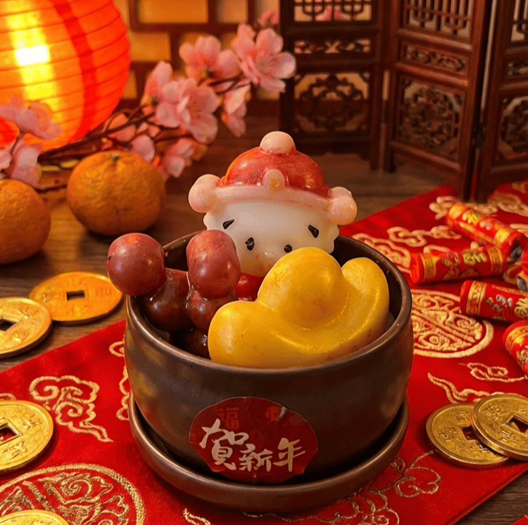 Set against classic festive decor including glowing red lanterns, gold coins, fresh mandarins, pink cherry blossoms, and a red brocade runner with golden cloud patterns, the candle is a vibrant focal point for Lunar New Year celebrations. When lit, it casts a warm, welcoming glow that enhances the joyful atmosphere, making it an ideal home decoration or heartfelt gift to share wishes of wealth and good luck with loved ones.