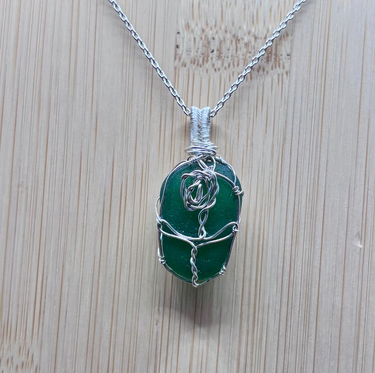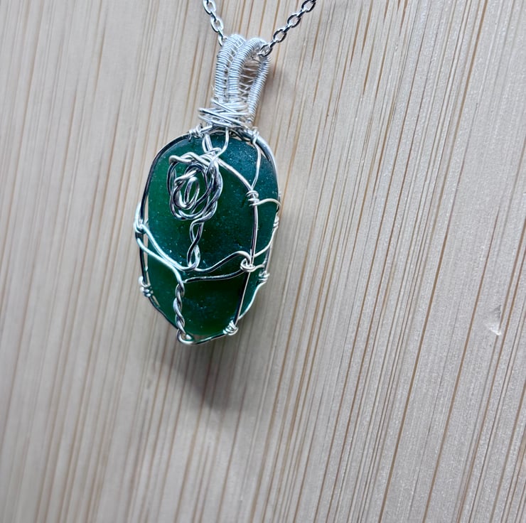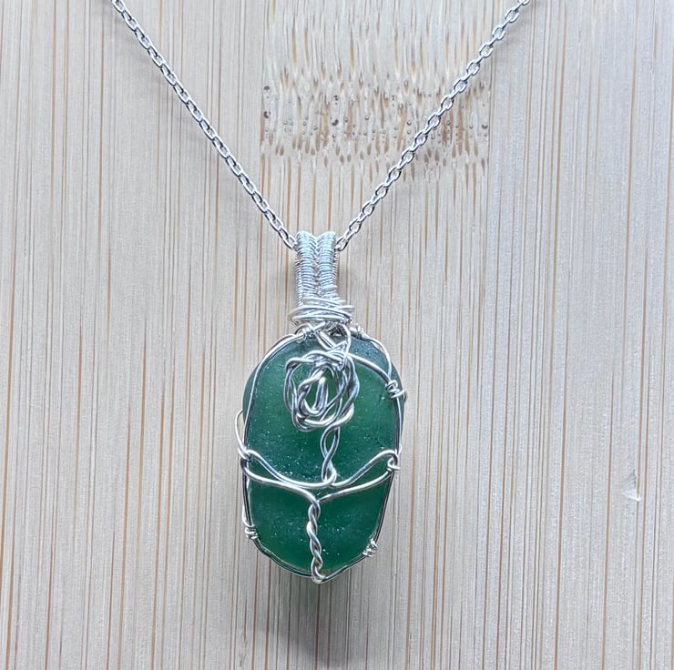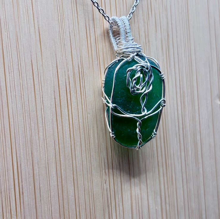 We have created a gorgeous Scottish sea glass necklace with rose design. The pendant includes a 20" Sterling Silver trace chain. The sea glass wrapped using enamelled copper jewellery wire. The green sea glass is absolutely stunning!