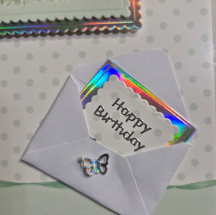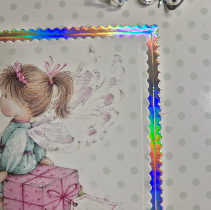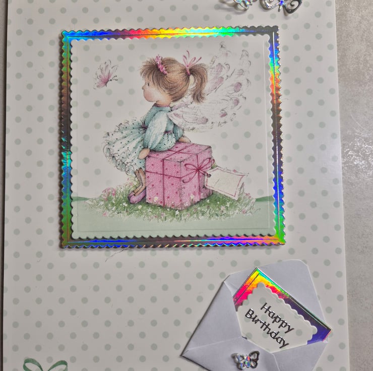 Cute fairy birthday card for young child. The fairy is sitting on a pink parcel looking at a pink butterfly. The topper is edged with silver holographic card which shows up as being very colourful in the pictures. There are also 3 holographic butterflies.