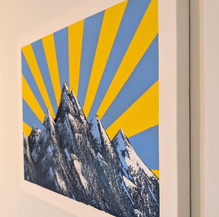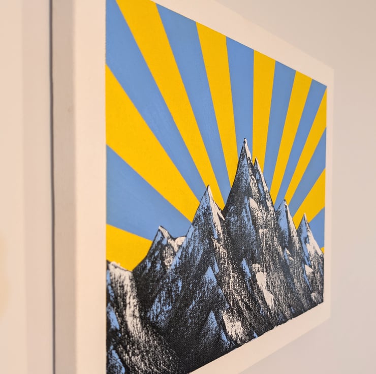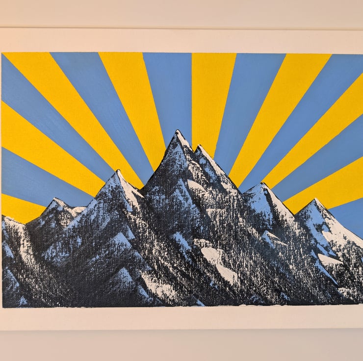 Original A3 canvas of a blue sunbeam sunset over a snow capped mountain range. Painted in oils