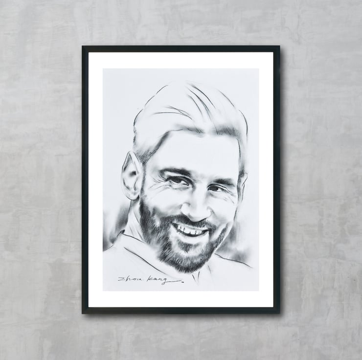 An original charcoal drawing of Lionel Messi on high quality paper. It captures a warm and natural smile. The eyes are carefully detailed, giving the portrait a strong sense of presence and individuality. Thoughtfully made and one of a kind, it makes a perfect gift or present for birthdays, anniversaries, special occasions—or simply to brighten someone’s day.